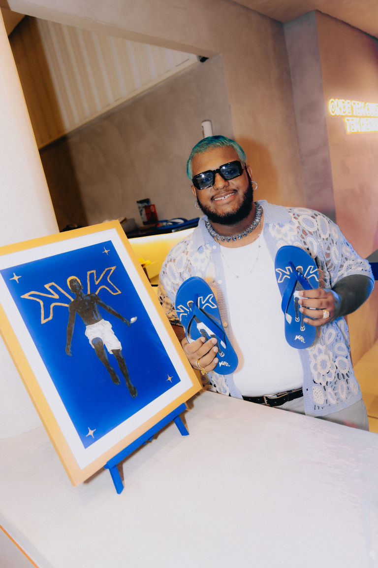 Segundo Saturno, o processo foi construído em quatro mãos. “Tudo foi pensado junto ao time criativo da Kenner desde o início. As sandálias, além da arte autoral, aparecem também com elementos muito evidentes e específicos do meu trabalho, como a rosa dourada e a estrela”, afirmou. Um dos pares traz uma arte criada especialmente para o projeto, um garoto negro de olhos fechados voando, com asas desenhadas a partir do “K” icônico da marca.