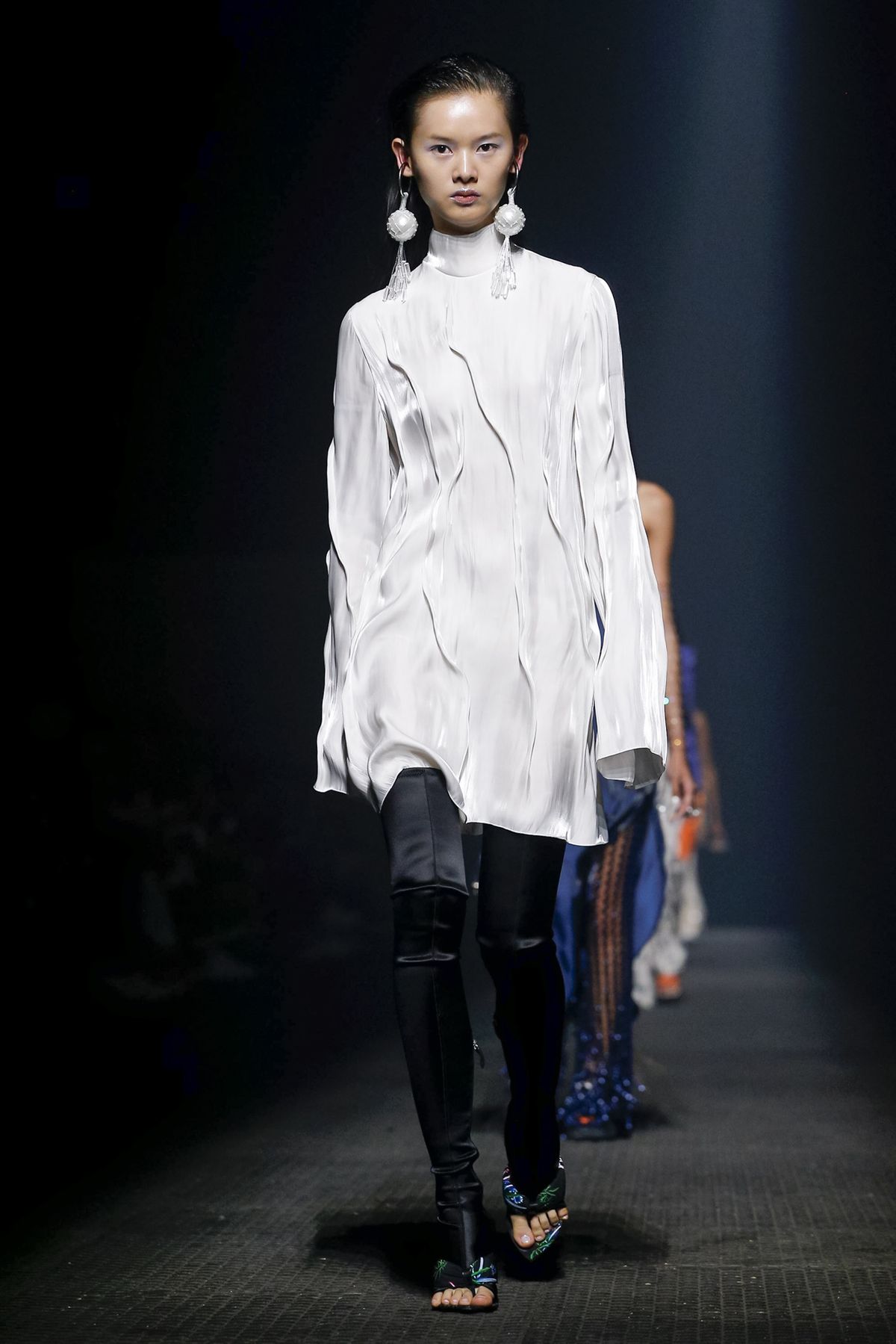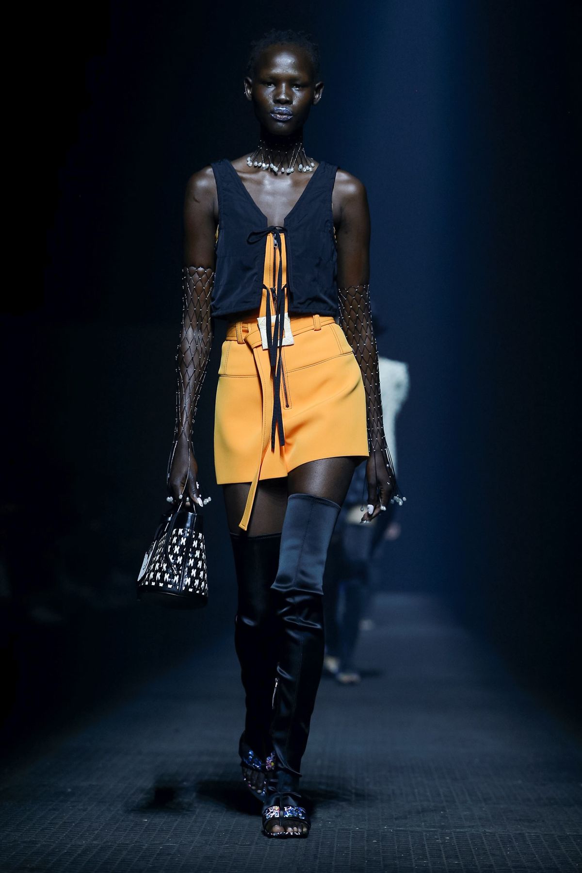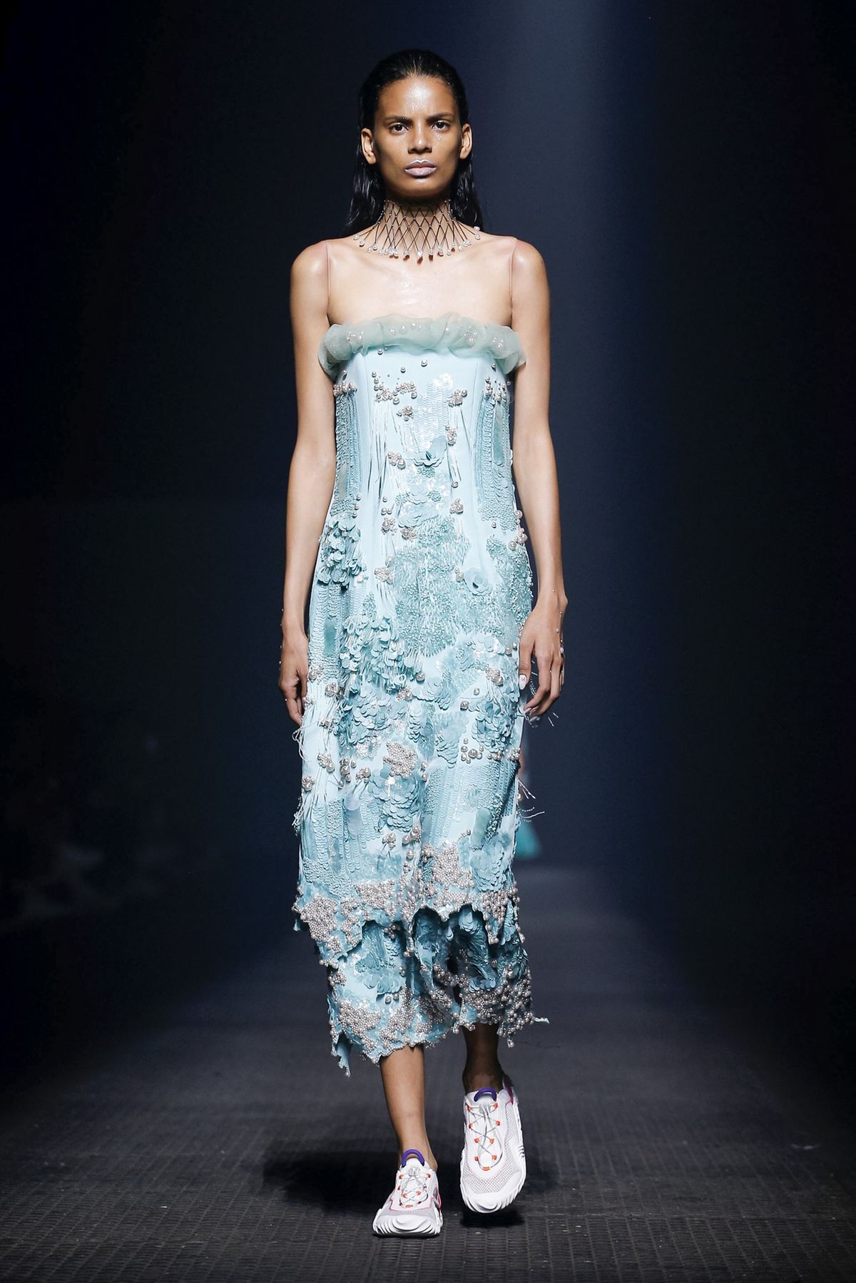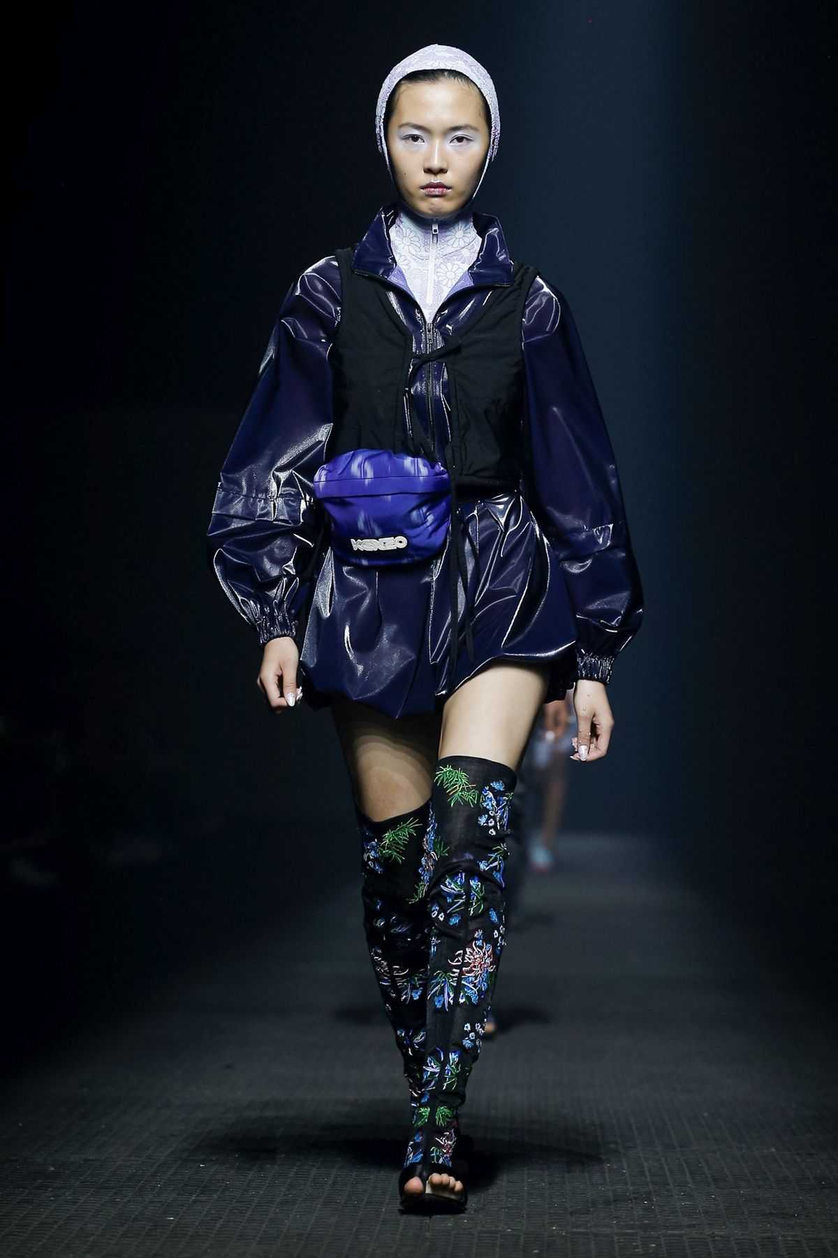A capa de chuva azul escura é o toque futurista que deu finesse ao desfile.