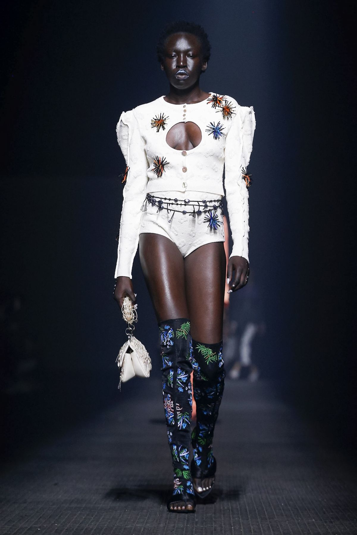 O conjuntinho branco com aplicações de bordados é sexy e ganha botas over the knee estampadas para enriquecer o visual.