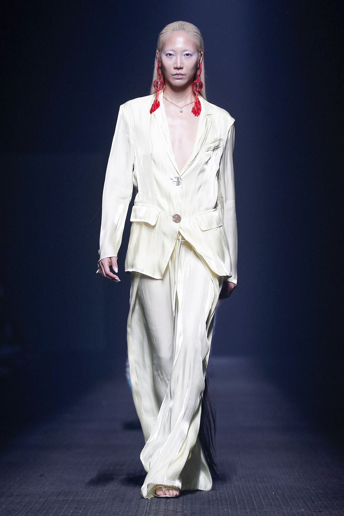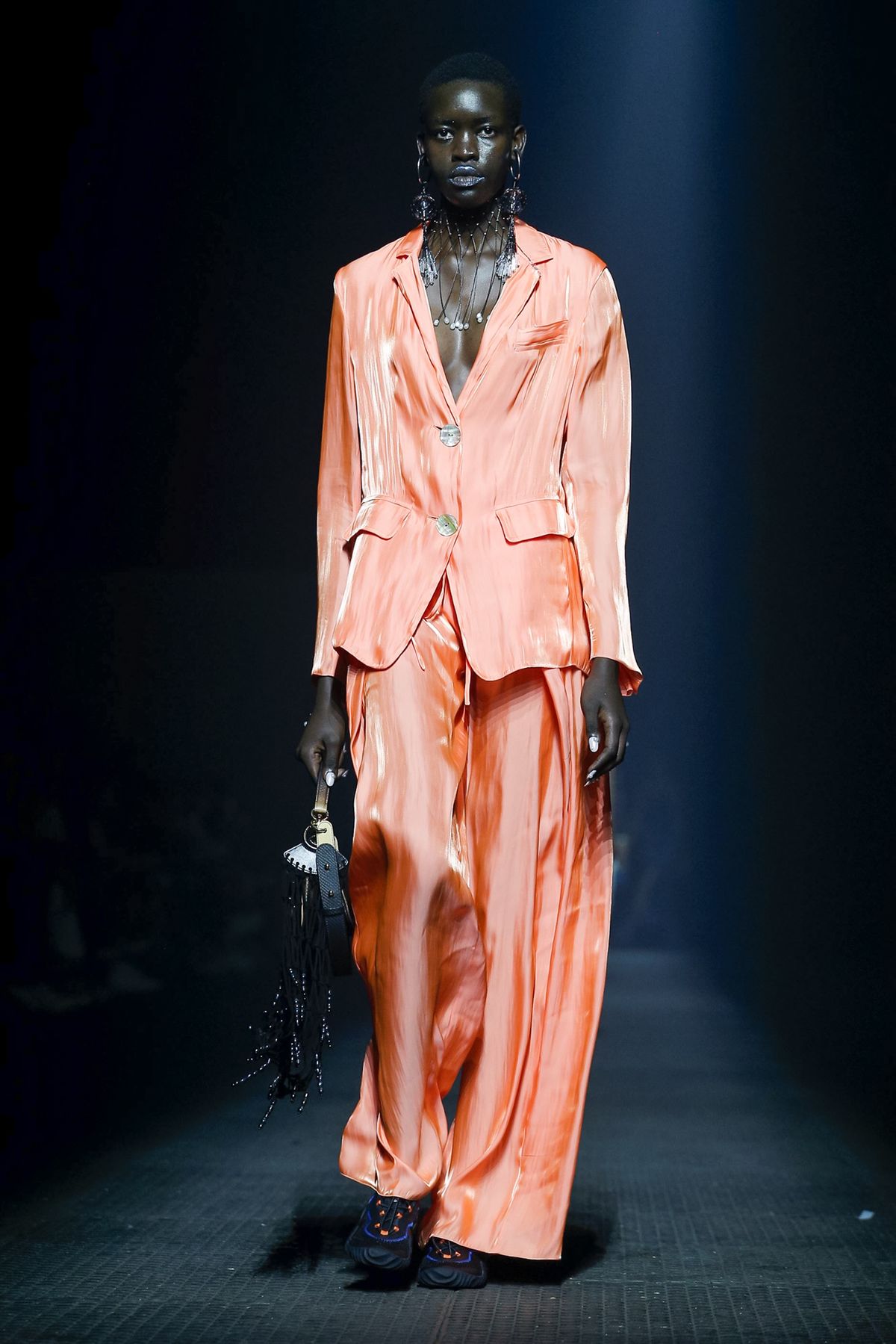 O terninho laranja é pura elegância, e ganha um twist comfy com o tecido de seda.