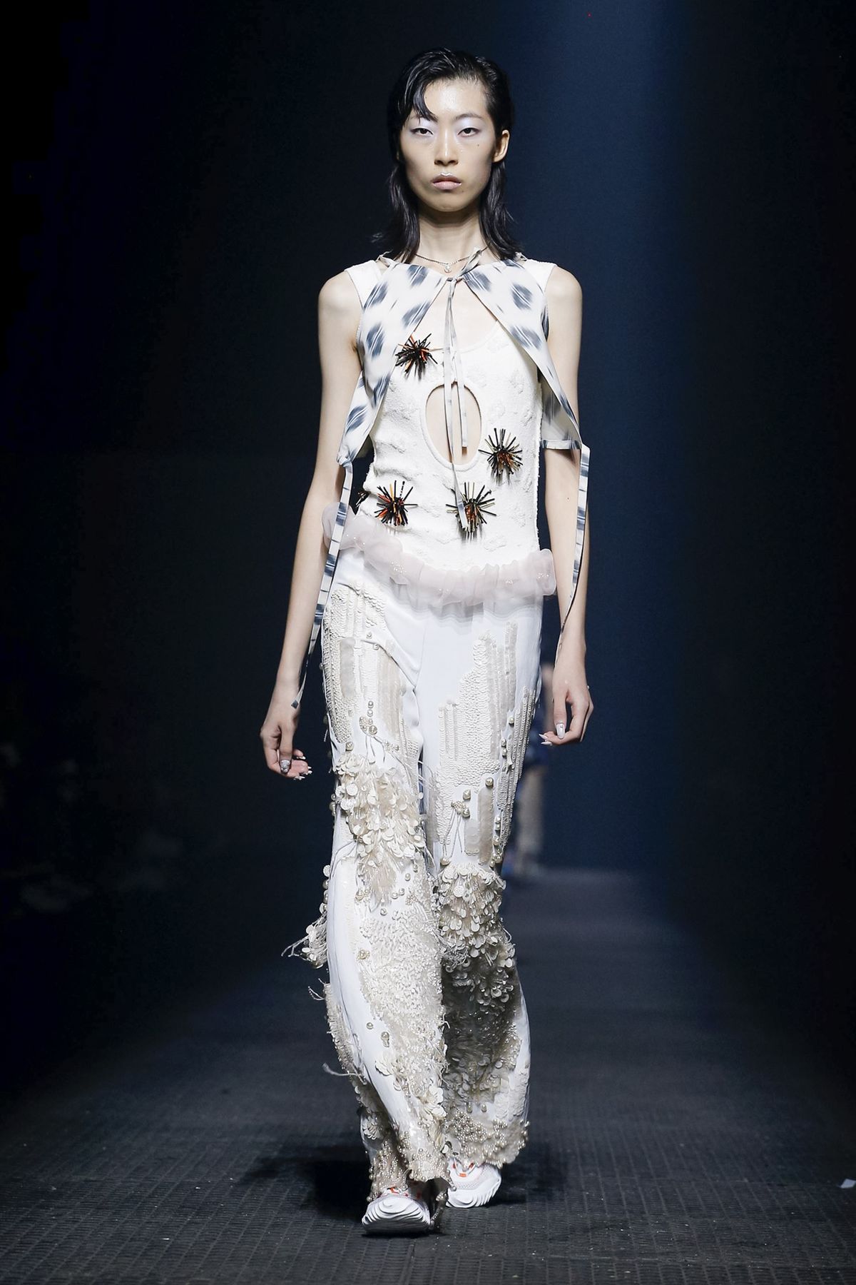A calça bordada branca foi combinada com sneakers, também brancos.