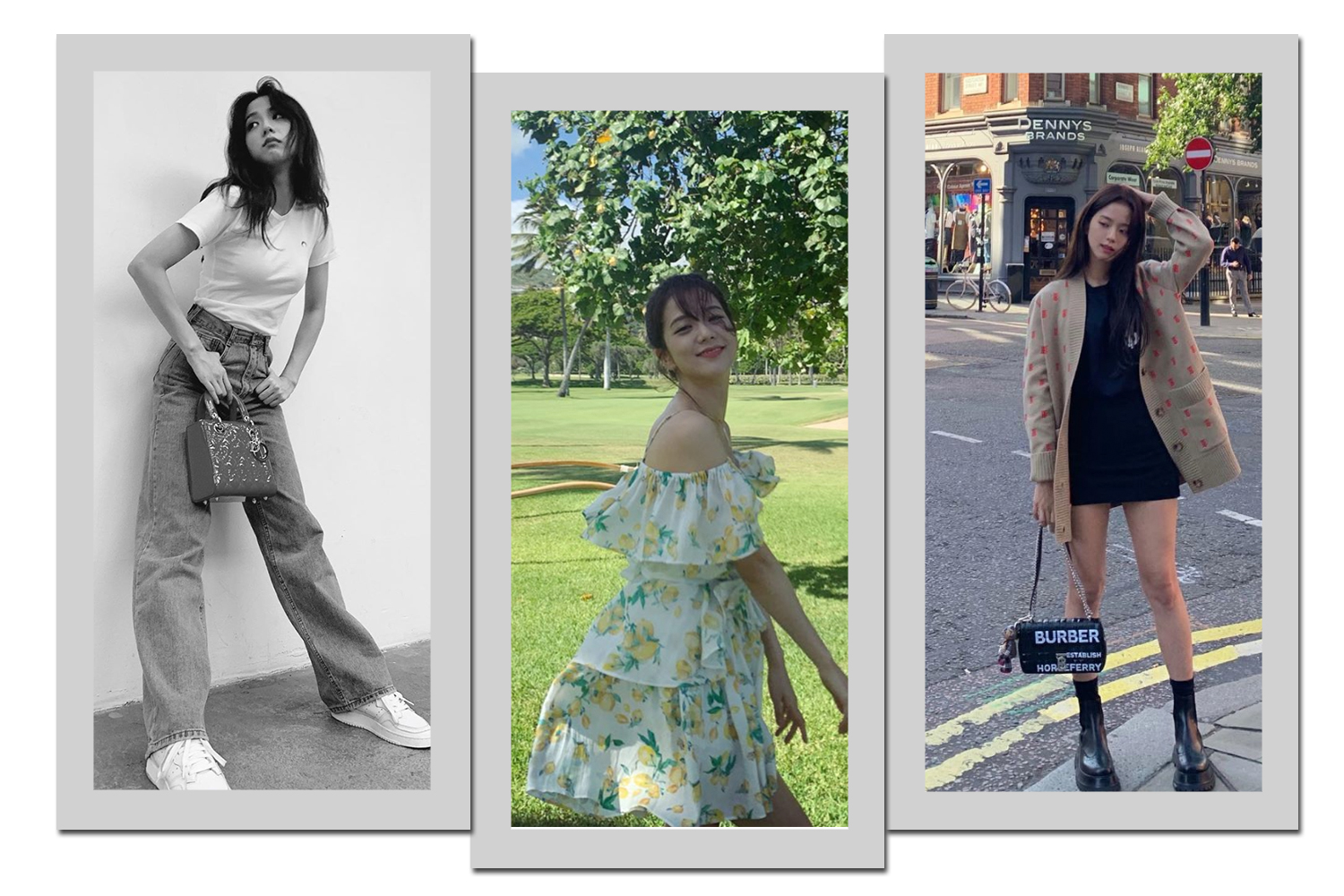 Para o look do dia, Jisoo é prática e, dependendo de seu humor, a cada dia ela interpreta uma informação de moda diferente. Por exemplo, a calça jeans e a t-shirt branca são uma combinação clássica, onde a bolsa Dior é o que enriquece o estilo. Para um dia mais quente, o vestidos fluído de babados é a melhor opção.