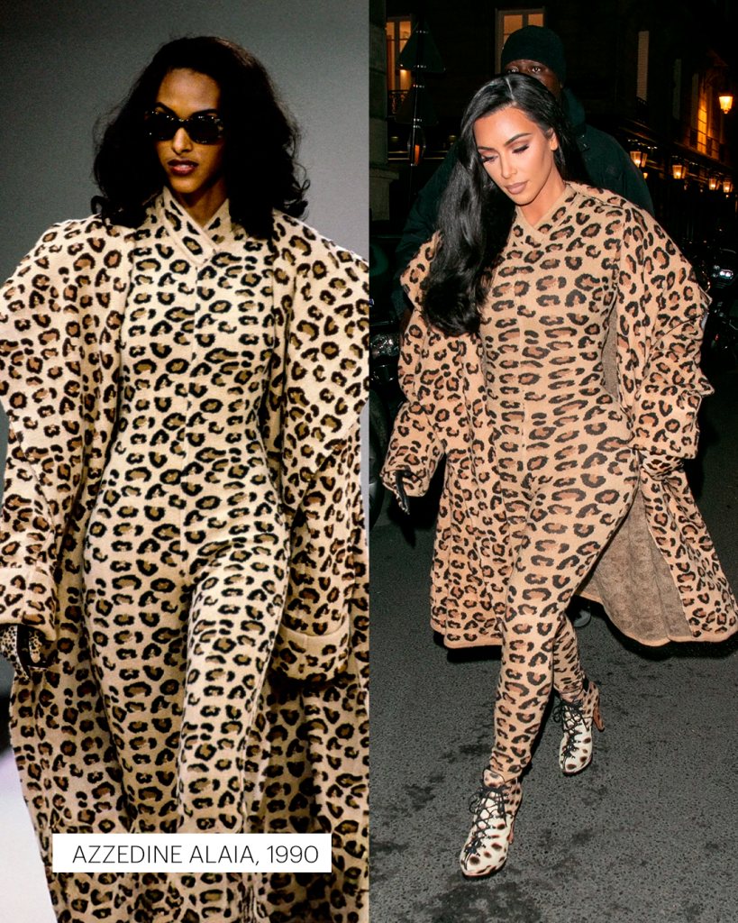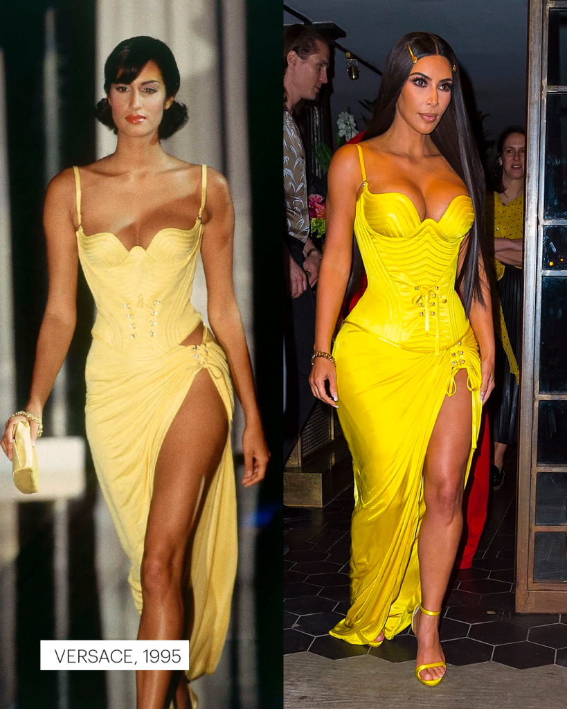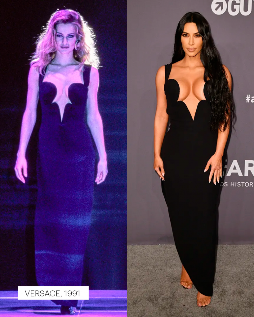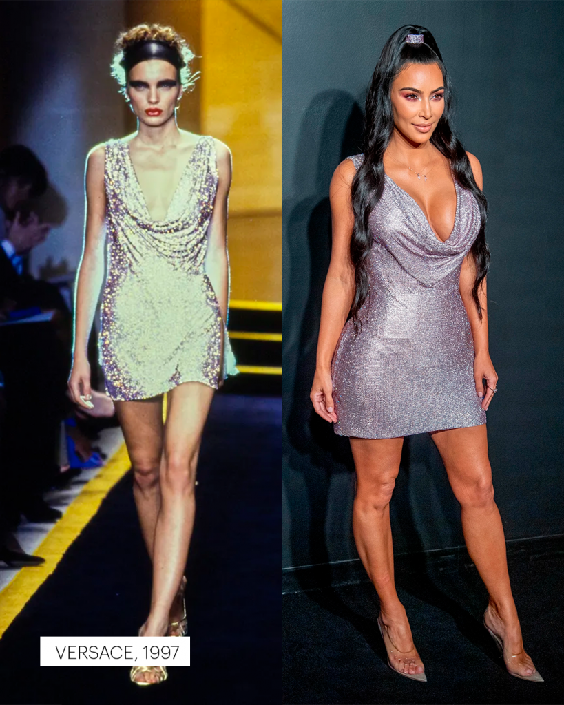 Em Paris, Nova York ou Los Angeles, Kim desfila criações que já fizeram história: o raríssimo body de oncinha de Azzedine Alaïa dos anos 1990, avaliado em cerca de 10 mil dólares; o “Oyster Dress” de Alexander McQueen, da coleção primavera/verão 2003; o vestido de Tom Ford para Gucci, um dos itens mais disputados entre colecionadores; e o icônico vestido de Gianni Versace de 1996, eternizado por Naomi Campbell nas passarelas.