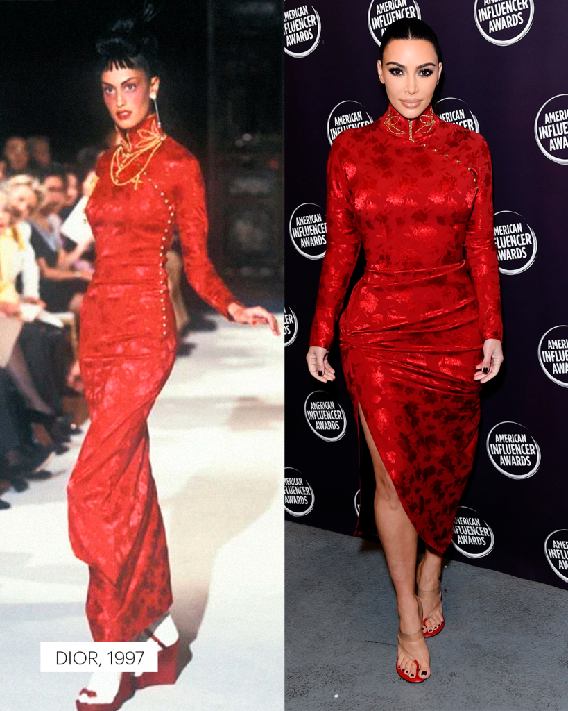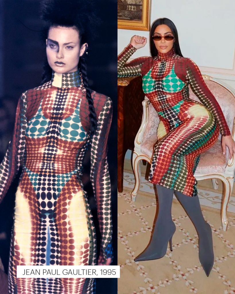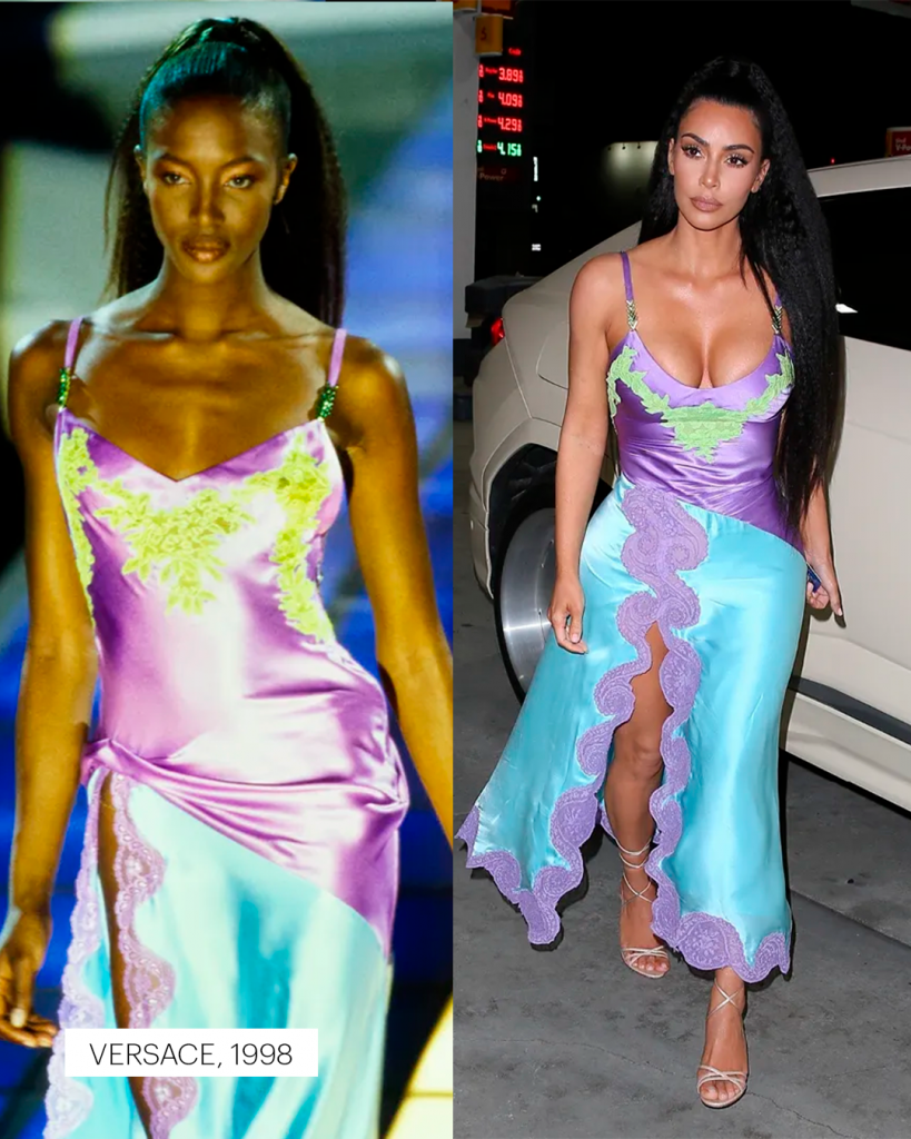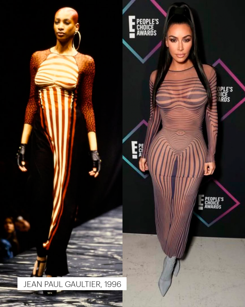 Em Paris, Nova York ou Los Angeles, Kim desfila criações que já fizeram história: o raríssimo body de oncinha de Azzedine Alaïa dos anos 1990, avaliado em cerca de 10 mil dólares; o “Oyster Dress” de Alexander McQueen, da coleção primavera/verão 2003; o vestido de Tom Ford para Gucci, um dos itens mais disputados entre colecionadores; e o icônico vestido de Gianni Versace de 1996, eternizado por Naomi Campbell nas passarelas.