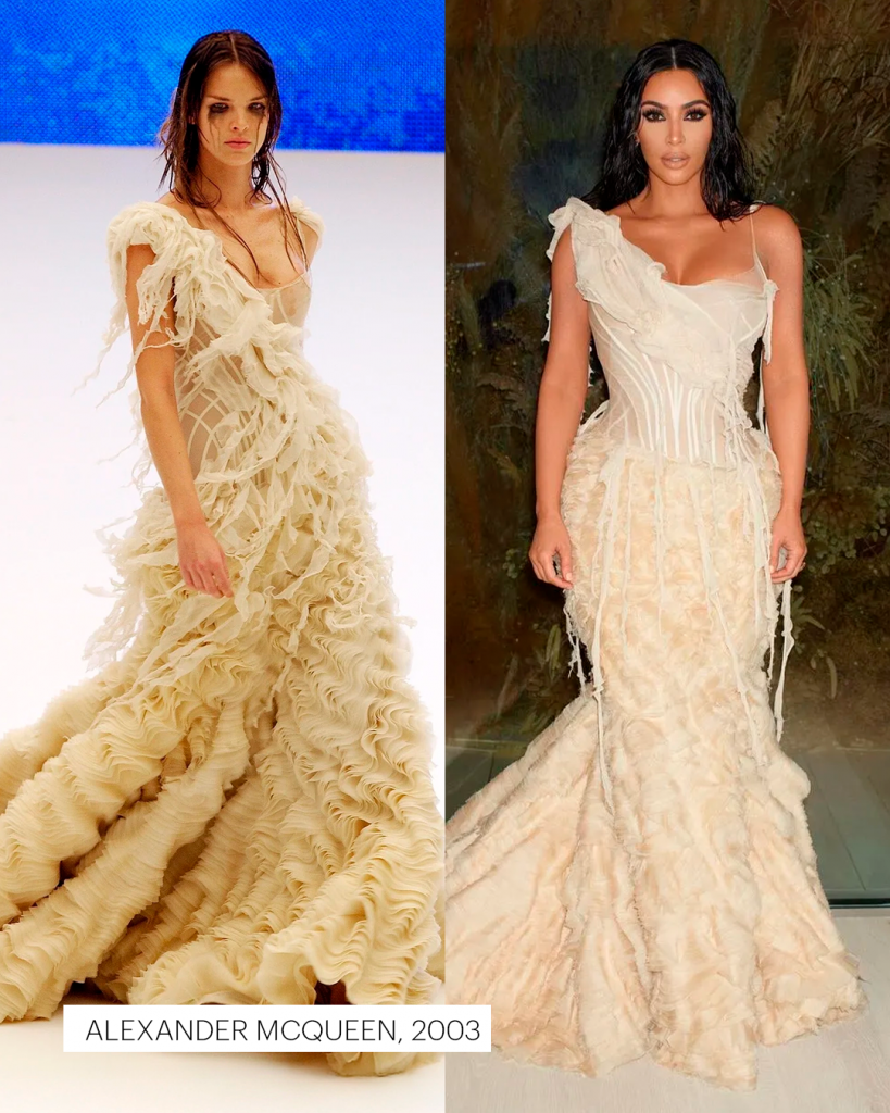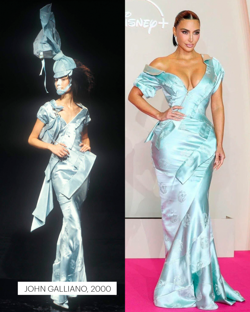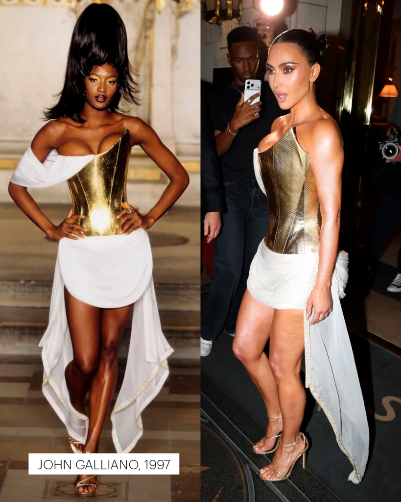 A lista cresce a cada aparição — e o capítulo mais recente veio em sua festa de 45 anos, em Paris. Kim surgiu com um vestido vintage Givenchy assinado por Alexander McQueen para a coleção de alta-costura de 1997. A peça, usada originalmente por Naomi Campbell, combina um corset dourado esculpido e uma saia branca drapeada, em referência às deusas gregas. O look resume seu novo paradigma: mais do que usar o passado, ela o reencena.