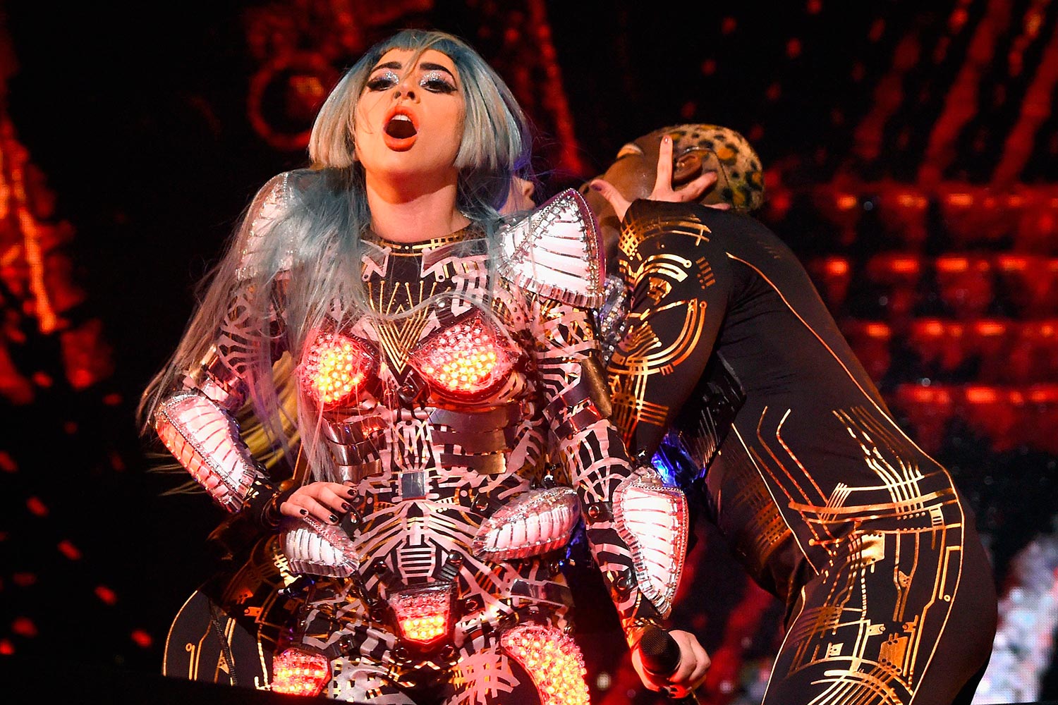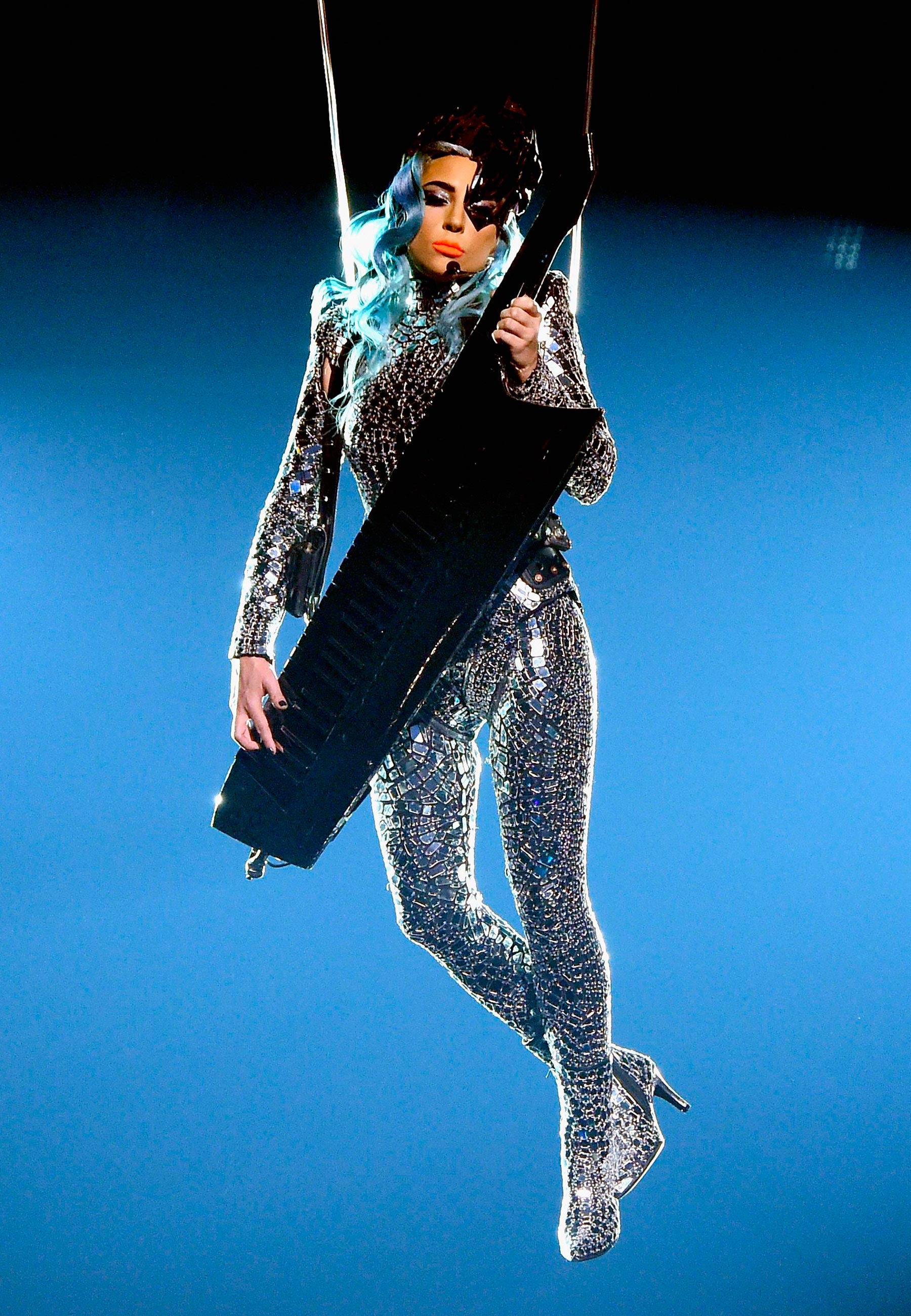 Lady Gaga desceu ao palco usando um macacão de joalharia. O cabelo estava azul-marinho e o batom era laranja – Foto: Getty Images