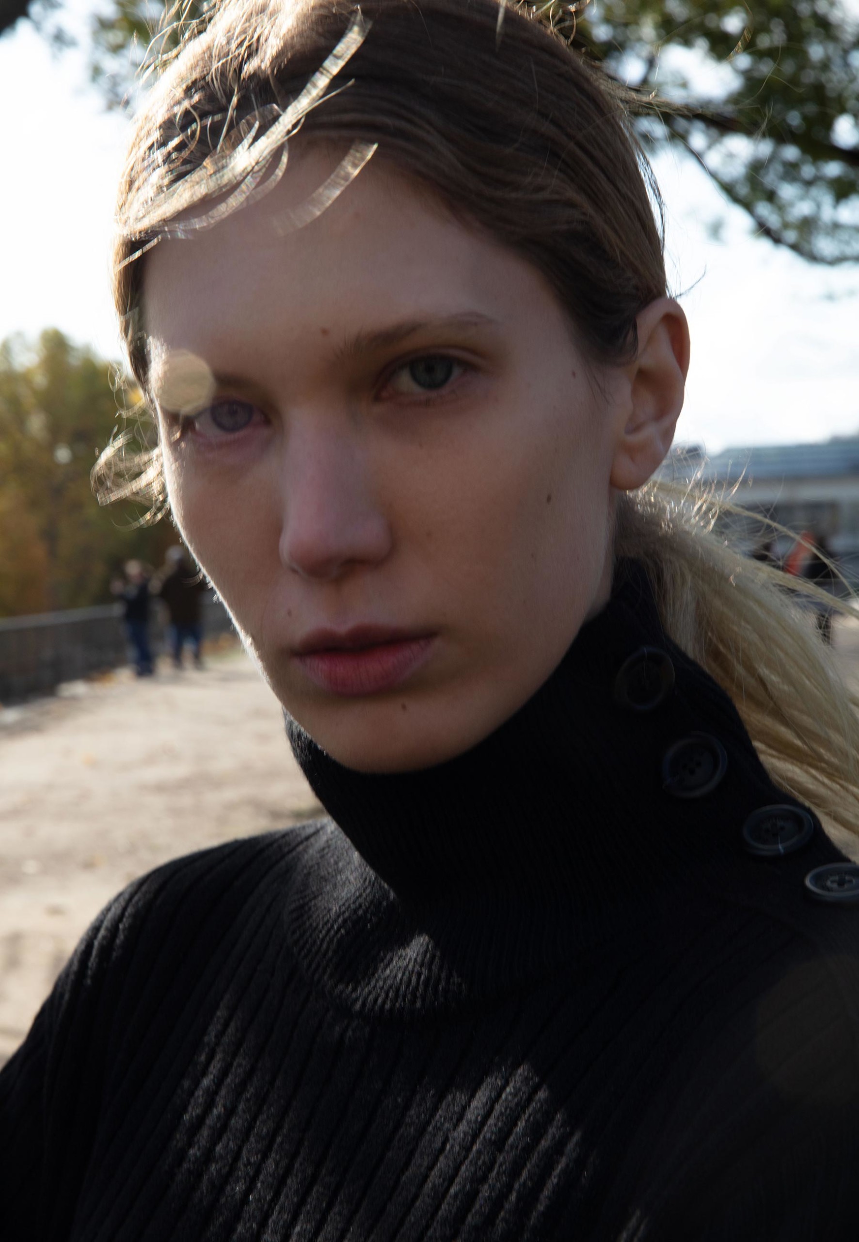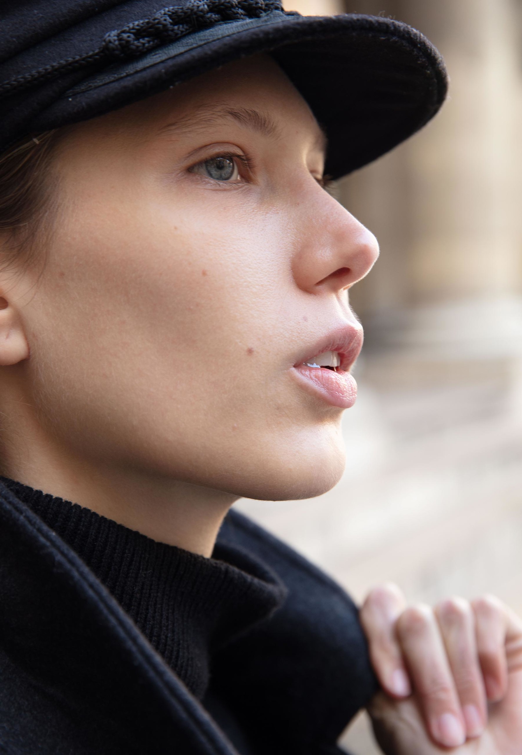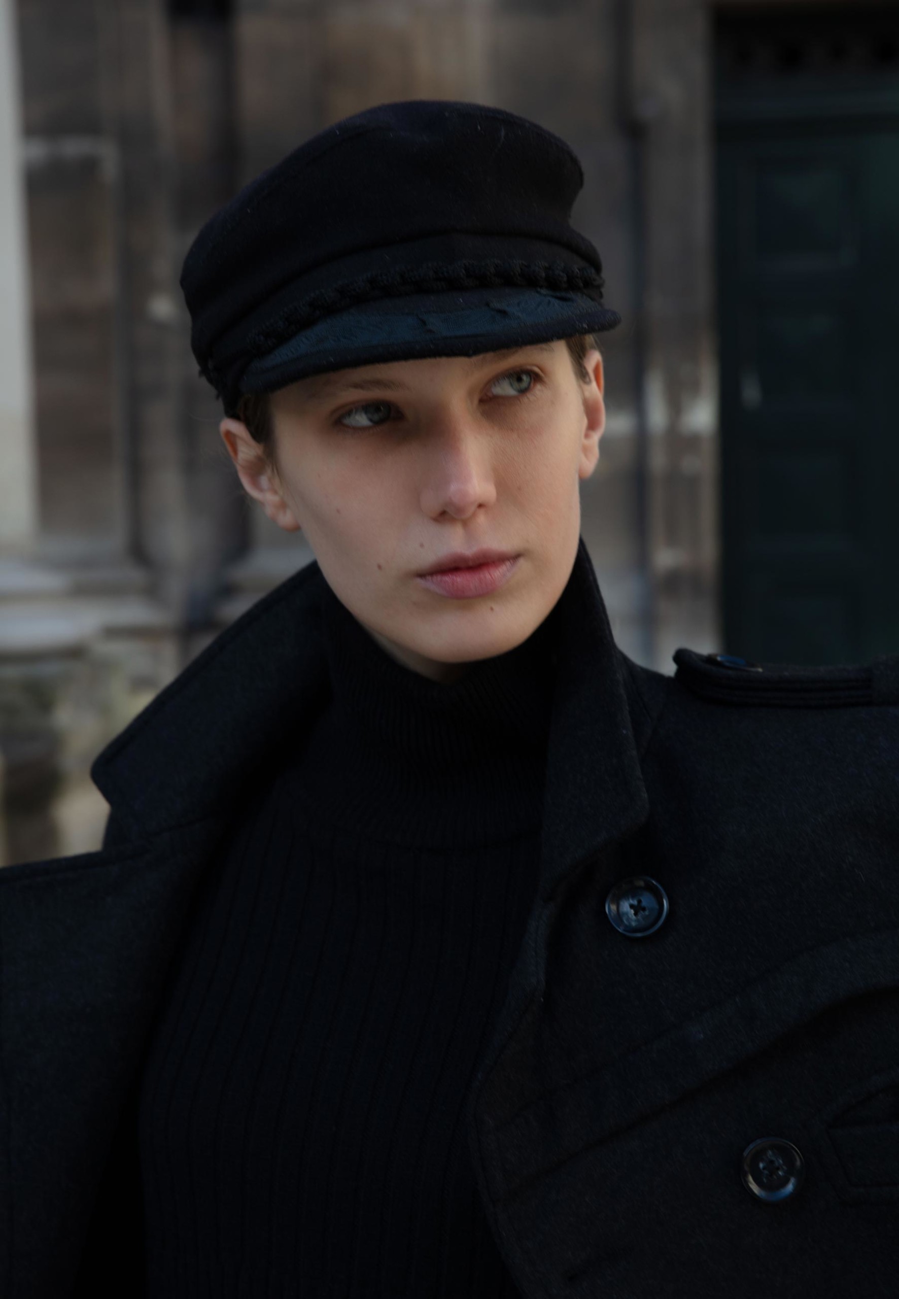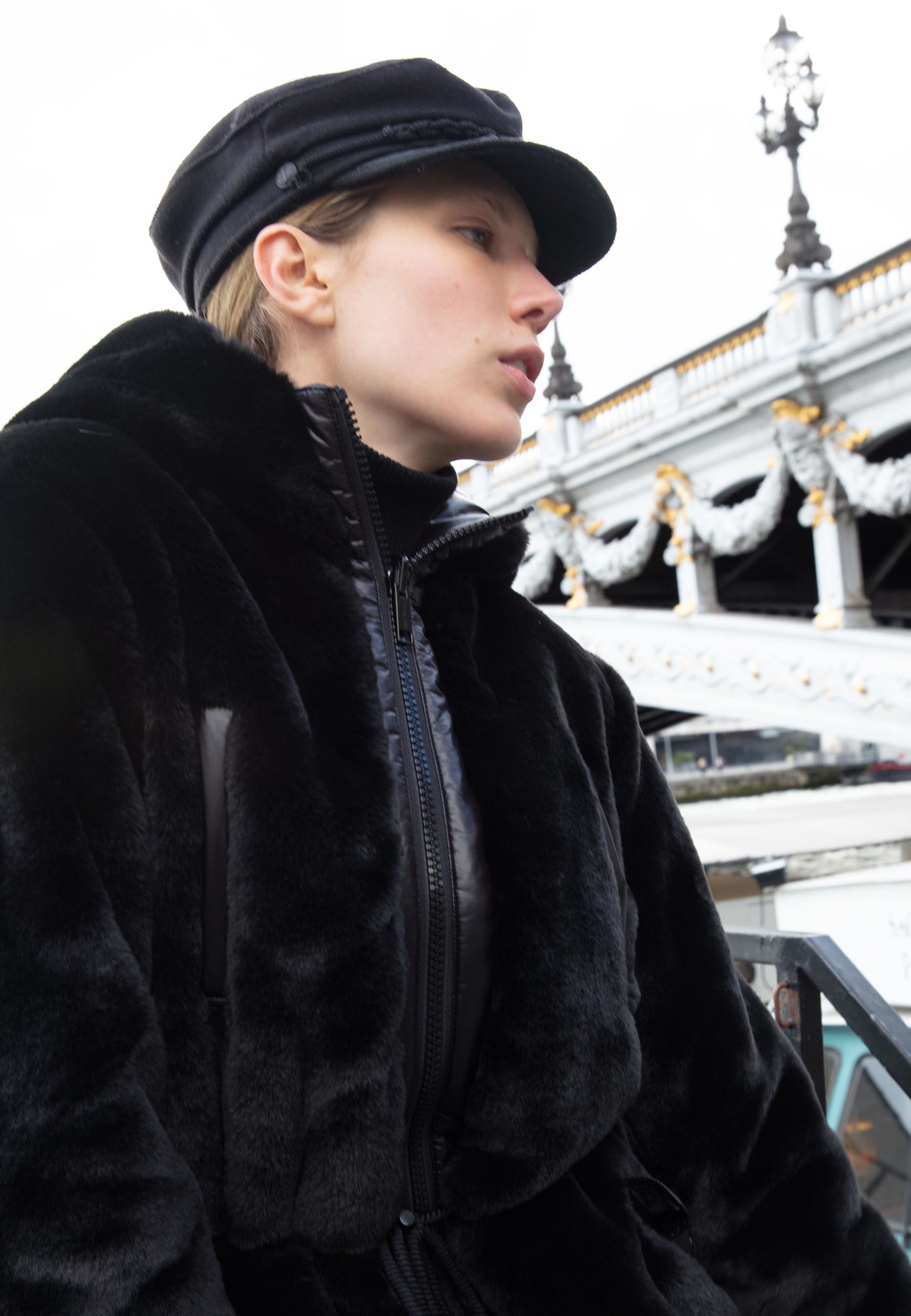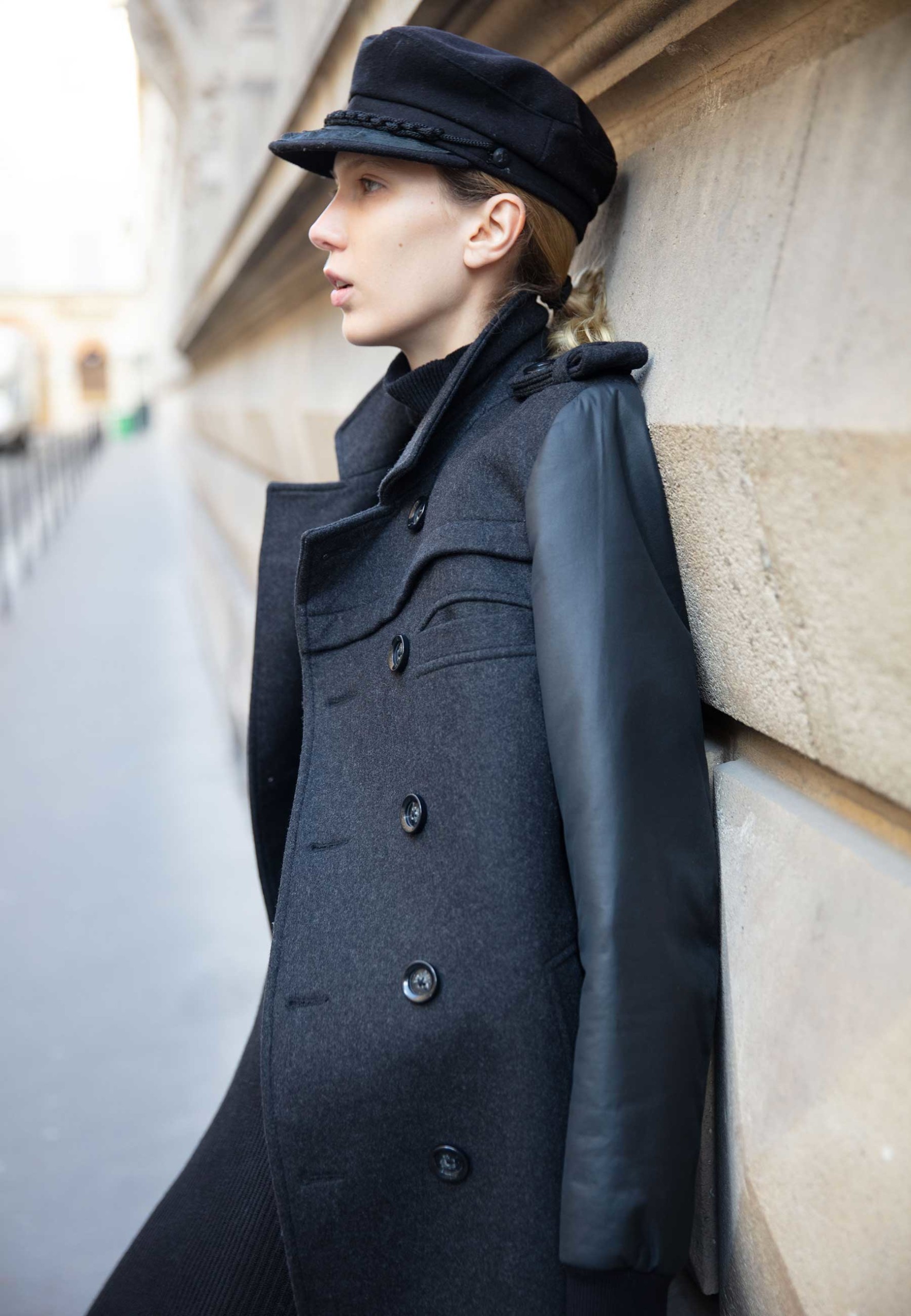Vestido tubo Wolford, boina Maison Michel e casaco Balenciaga.