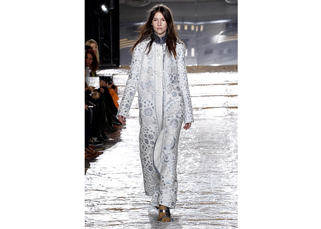 Clima glacial e influência nórdica foram o ponto de partida para a coleção da Peter Pilotto. A delicadeza dos borrões coloridos no céu pela aurora boreal aparecem na mistura de azuis que predominam sobre tons discretos de vermelho. Já a tundra ártica, fenômeno biológico mais frio do planeta, surge em brancos gélidos muito bem desenhados com linhas escuras e um leve tempero de marrom. Vestidos de mangas longas e calças combinadas com tops assimétricos traduzem os fenômenos climáticos com elegância e sutileza utilizando cetim, veludo e rendas. Veja a galeria!