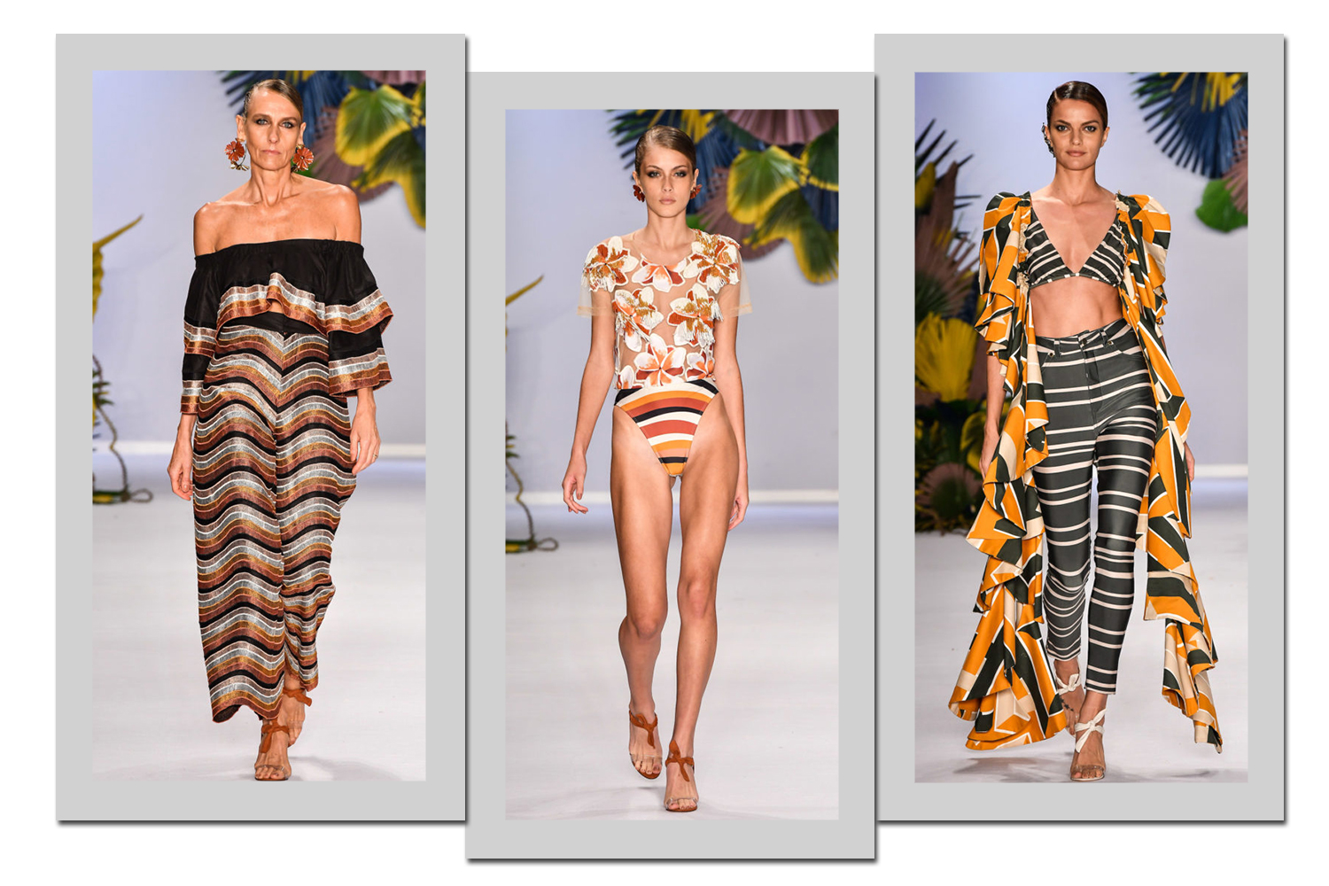 Já a carioca Salinas apostou no print em seu formato mais tradicional: bem largo, intercalado entre branco e laranja. Mas inovou também em uma versão geométrica, fazendo um círculo no maiô com pegada vintage. E apareceu no biquíni na versão vertical.