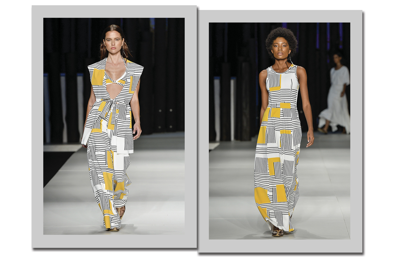 As listras apareceram em suas mais variadas versões. A Skazi, por exemplo, que colocou Juliana Paes e Ludmilla na passarela, apostou em uma versão esportiva do print, inspirada no jogo de tênis.