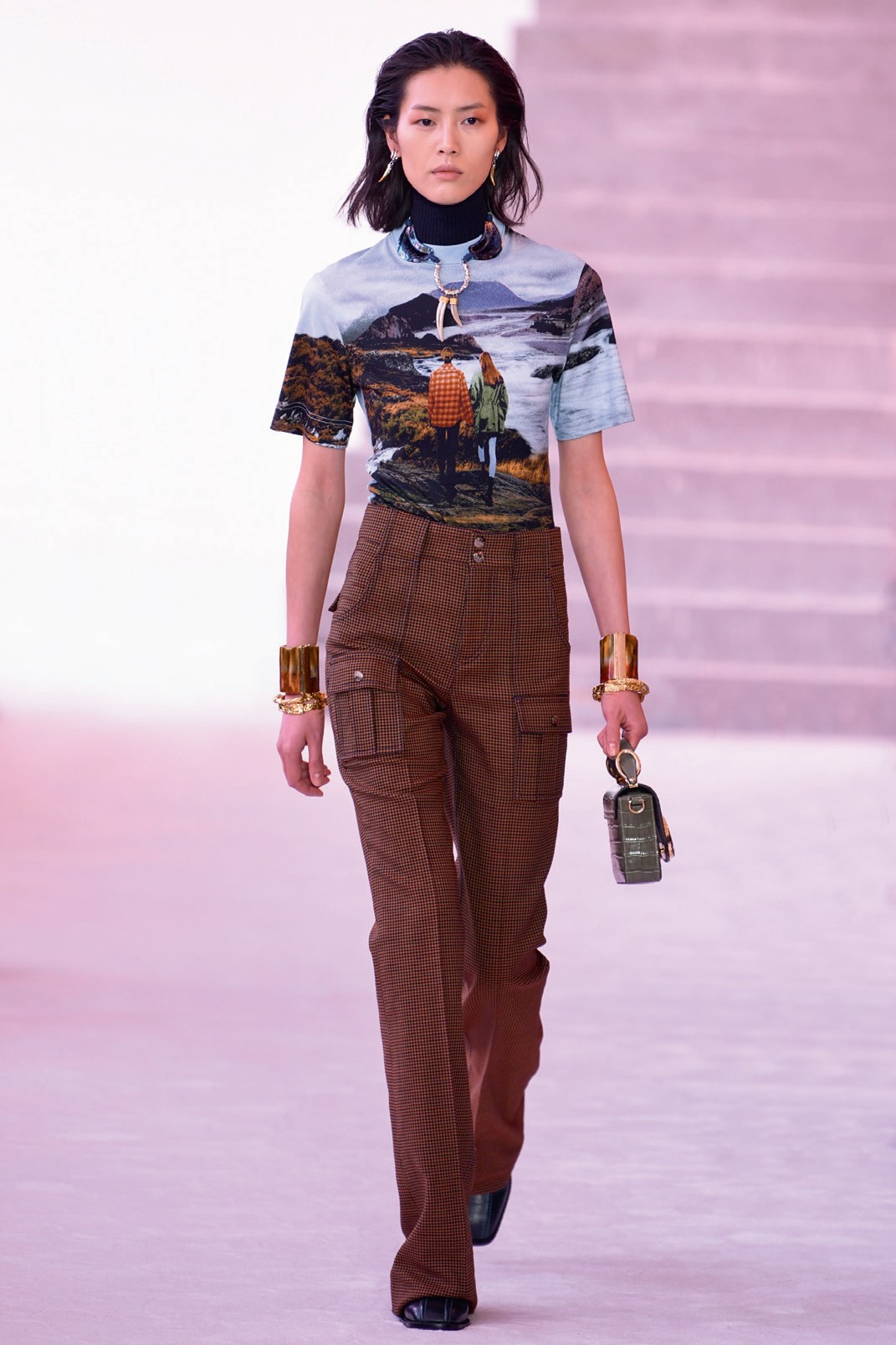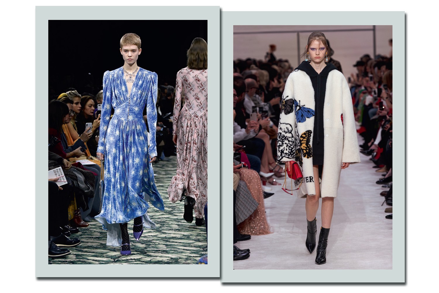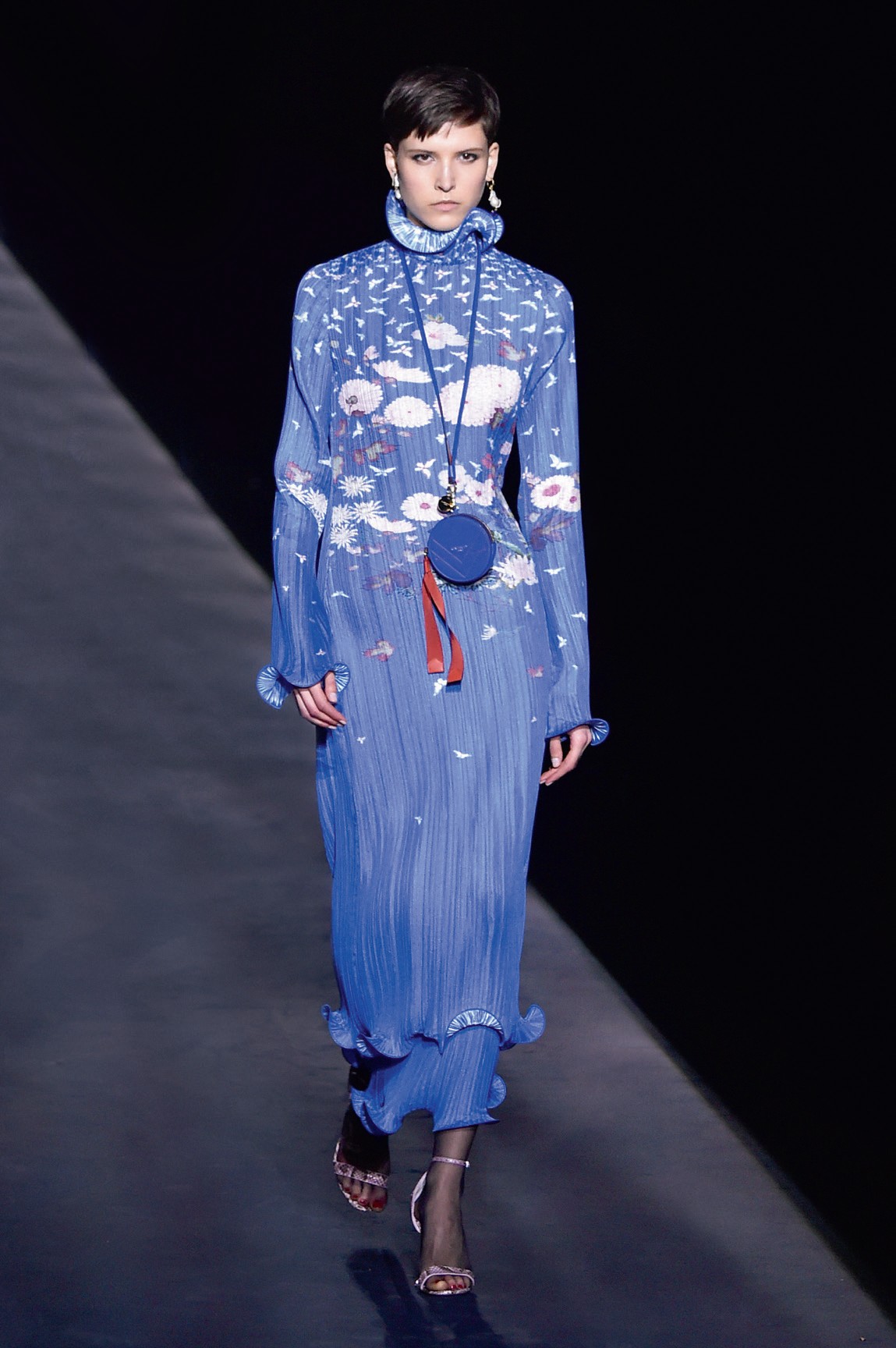 Já Clare Waight Keller foi buscar suporte estético no mítico Jardim do Éden para criar flores que mais parecem nuvens, rodeadas por borboletas brancas, sobre vestidos com microplissados. A imagem traz um estado contemplativo e harmônico, mas com certo humor, graças às barras sinuosas. O resultado é um antídoto fashionista contra a ansiedade.