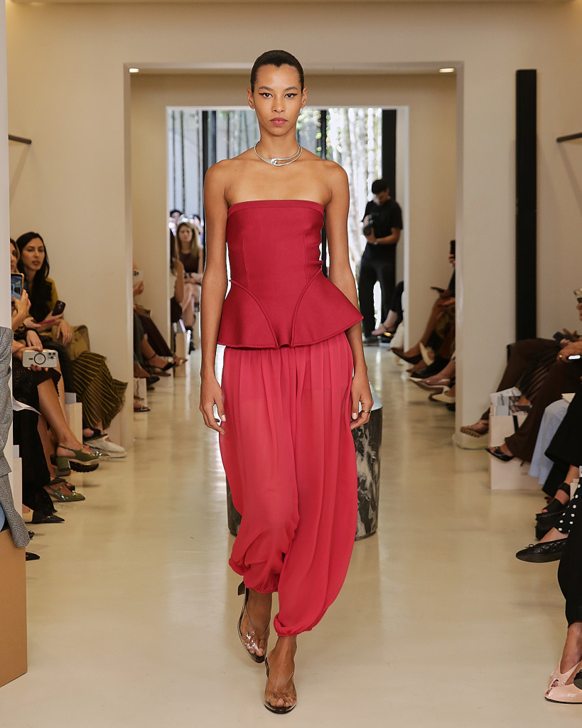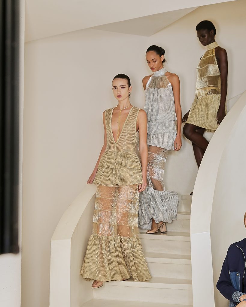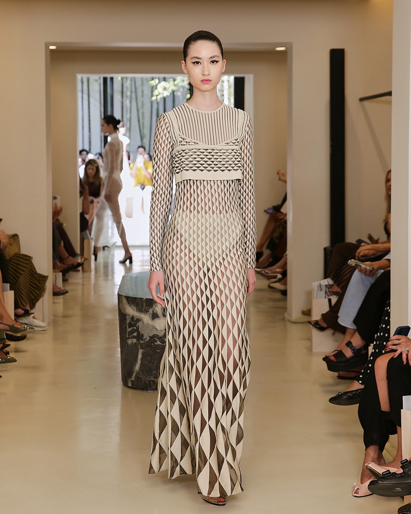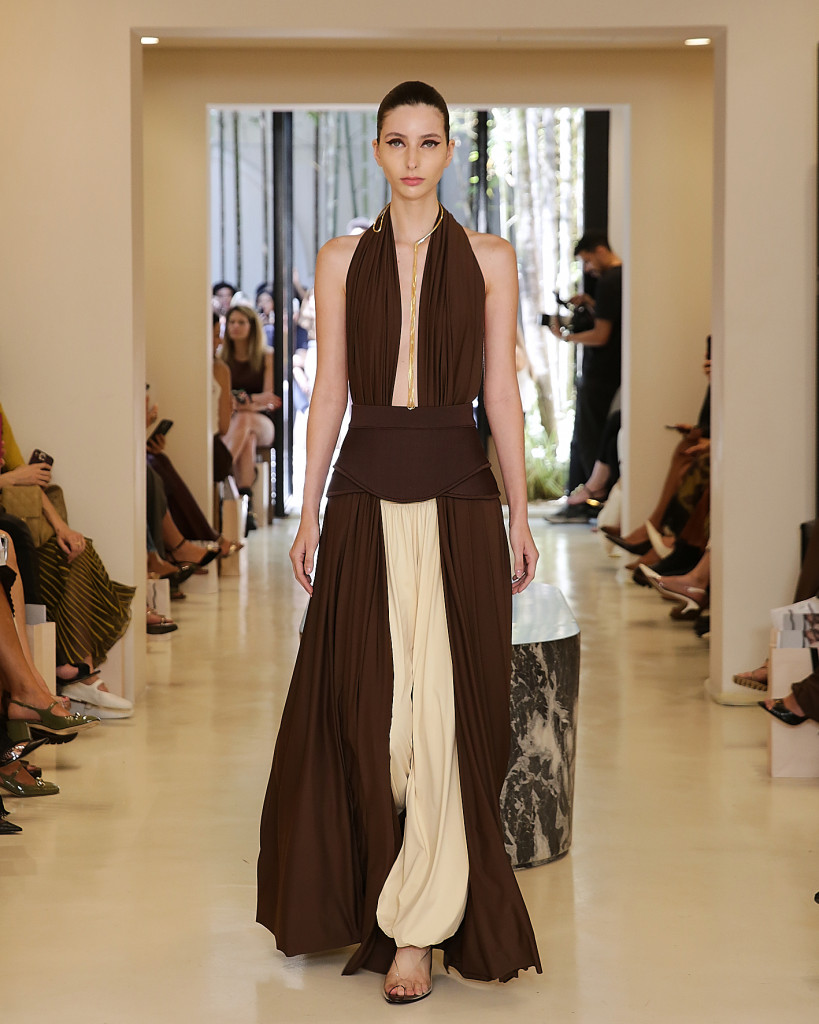 Transparências sofisticadas reforçaram a sensualidade sutil da marca, enquanto o jersey tecnológico trouxe contemporaneidade sem abrir mão da sofisticação. Tricôs metalizados, reluzindo como joias no corpo, deram um brilho preciso às composições. A paleta de cores percorreu tons de cacau, off-white, ivory amanteigado e framboesa, pontuados pelos metálicos dourado e prateado. As peças estão disponíveis para compra ou encomenda, sob medida, no Instagram, no site oficial e na concept store, no Jardim Europa.