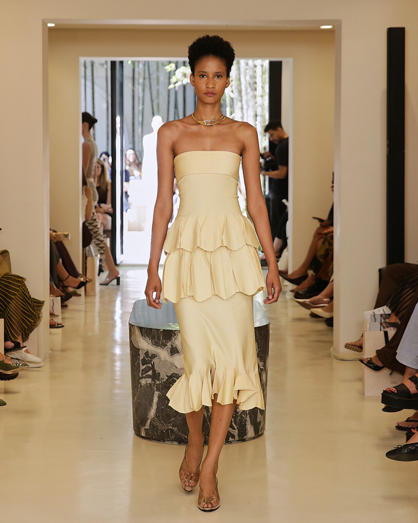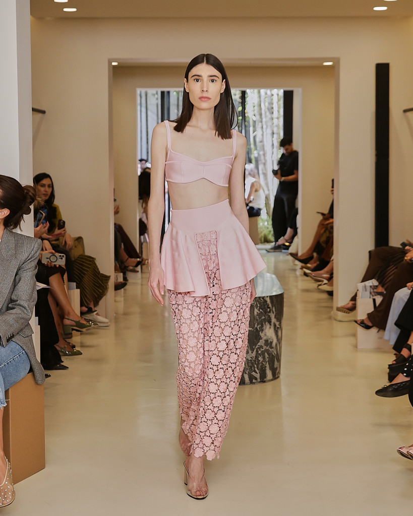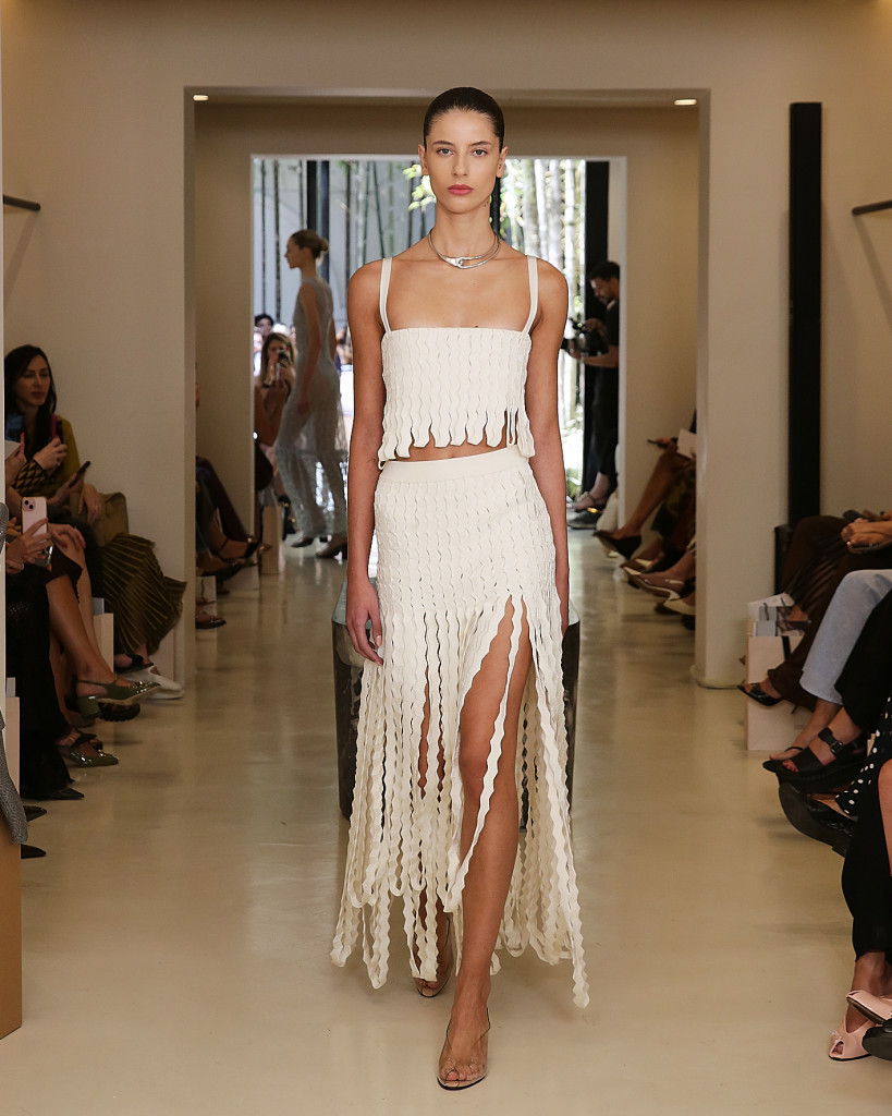 “É um momento muito bom da marca, onde a gente realmente se reconecta à nossa essência, a fazer peças que trazem o DNA da Lolitta, que é essa peça que ela é feita a partir de um fio, usando técnicas diferentes. Desde a técnica de pegar um fio e transformar numa renda, da tecnologia, dos bands que são também tricô, mas com esse reforço do corsê, trazendo essa feminilidade da marca, a transparência tem bastante evidência na coleção “, diz Hannud em entrevista à BAZAAR.