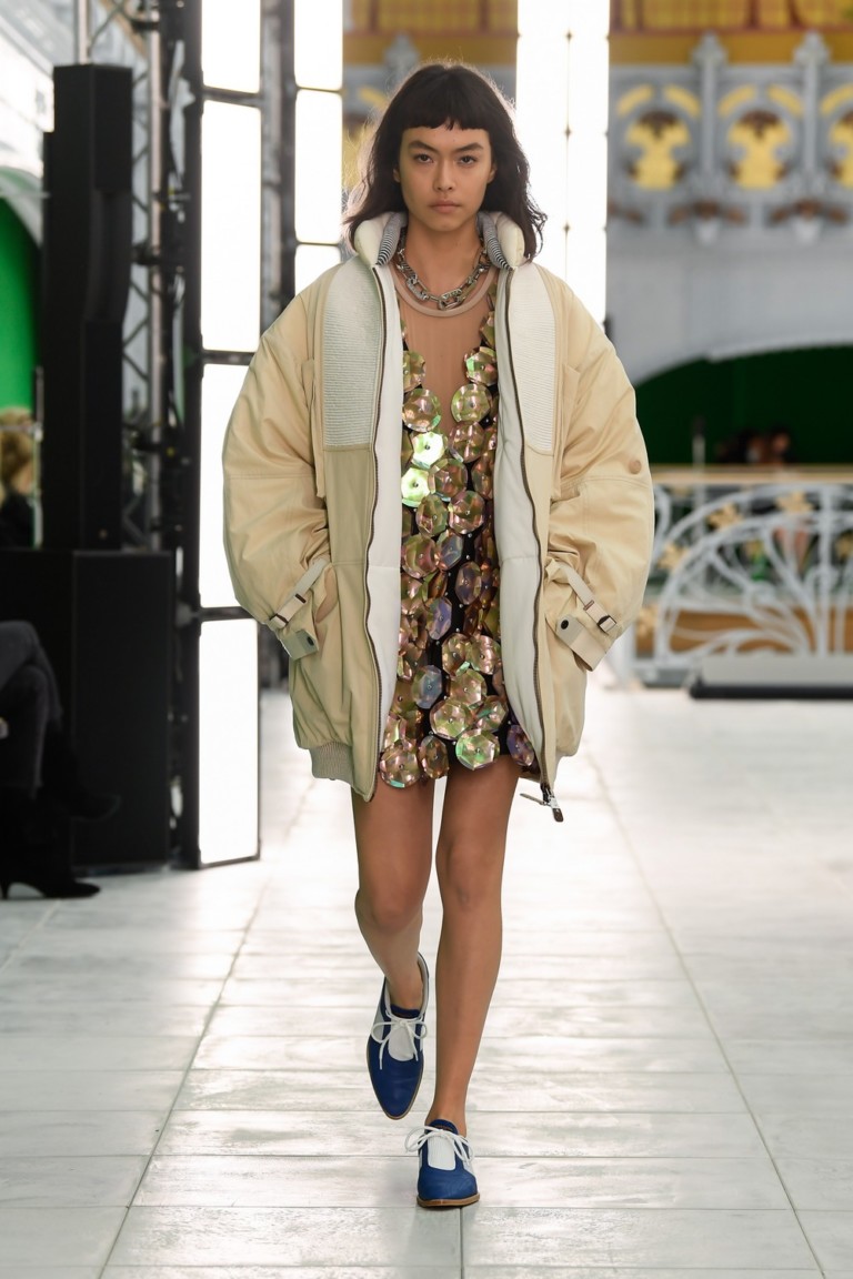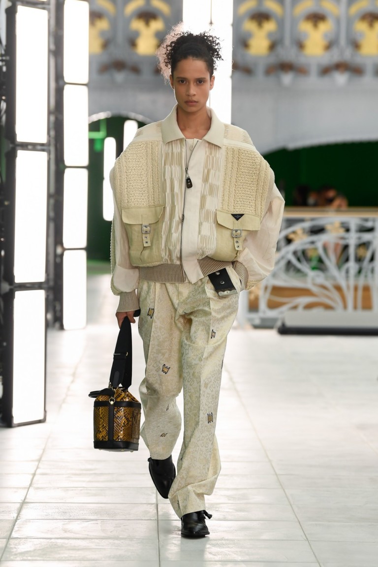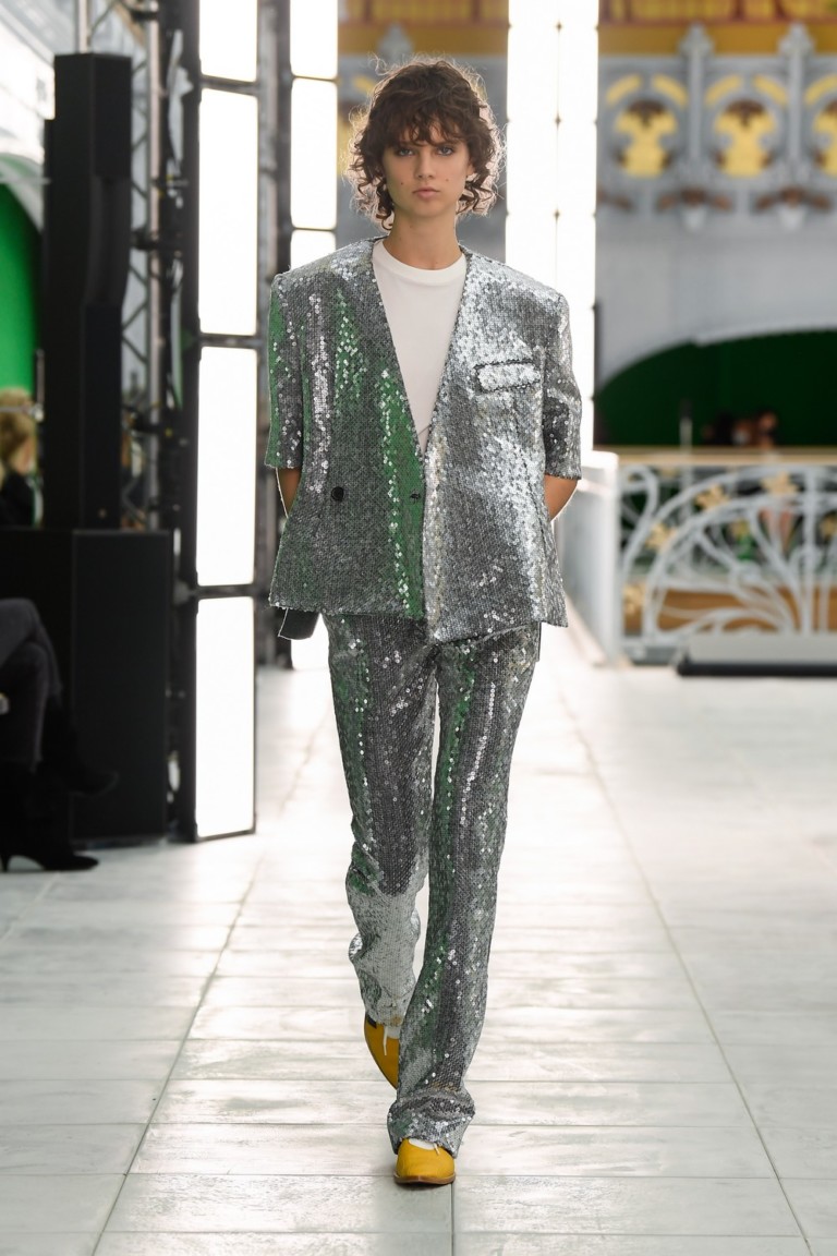 Ao mesmo tempo, Louis Vuitton valoriza o pequeno paetê em um conjunto com mangas curtas.