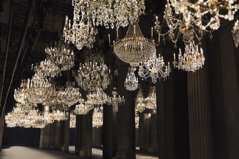 A Louis Vuitton escolheu uma passagem de pedestres ao lado da pirâmide do Louvre para mostrar sua coleção de verão 2022. Com lustres estilo “pampille” ao longo da passarela e cadeiras vermelhas de veludo, a atmosfera imperial já antecipava o que estava por vir na passarela.