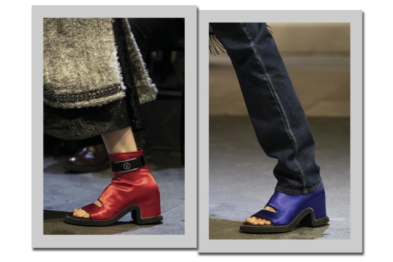 Foram muitos os calçados na passarela, mas a sandália de cetim conquistou a nossa preferência.