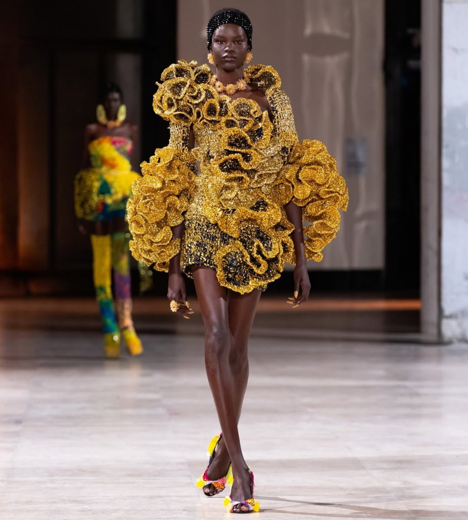 Em São Paulo, o impacto social se mistura com a experimentação de forma. No ateliê de Elias Kalleb, moulage, drapeados e acabamentos são feitos à mão diretamente no corpo. Sobras de tecido ganham nova vida em superfícies costuradas, recosturadas, quase esculpidas. Esses volumes vestem majoritariamente corpos negros e dissidentes, em propostas amplas e sem gênero rígido. O gesto manual não serve só para mostrar domínio técnico. Ele abre espaço para outros corpos dentro de um vocabulário histórico de luxo.