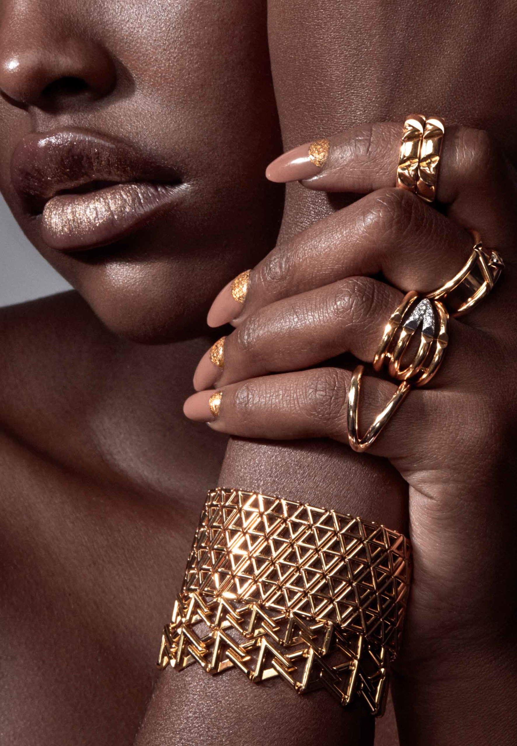 Francesca Amfitheatrof, diretora artística de joias e relógios da Louis Vuitton, parte das letras que formam o monograma da casa para construir, de forma arquitetônica, blocos que modernizam o emblemático LV.