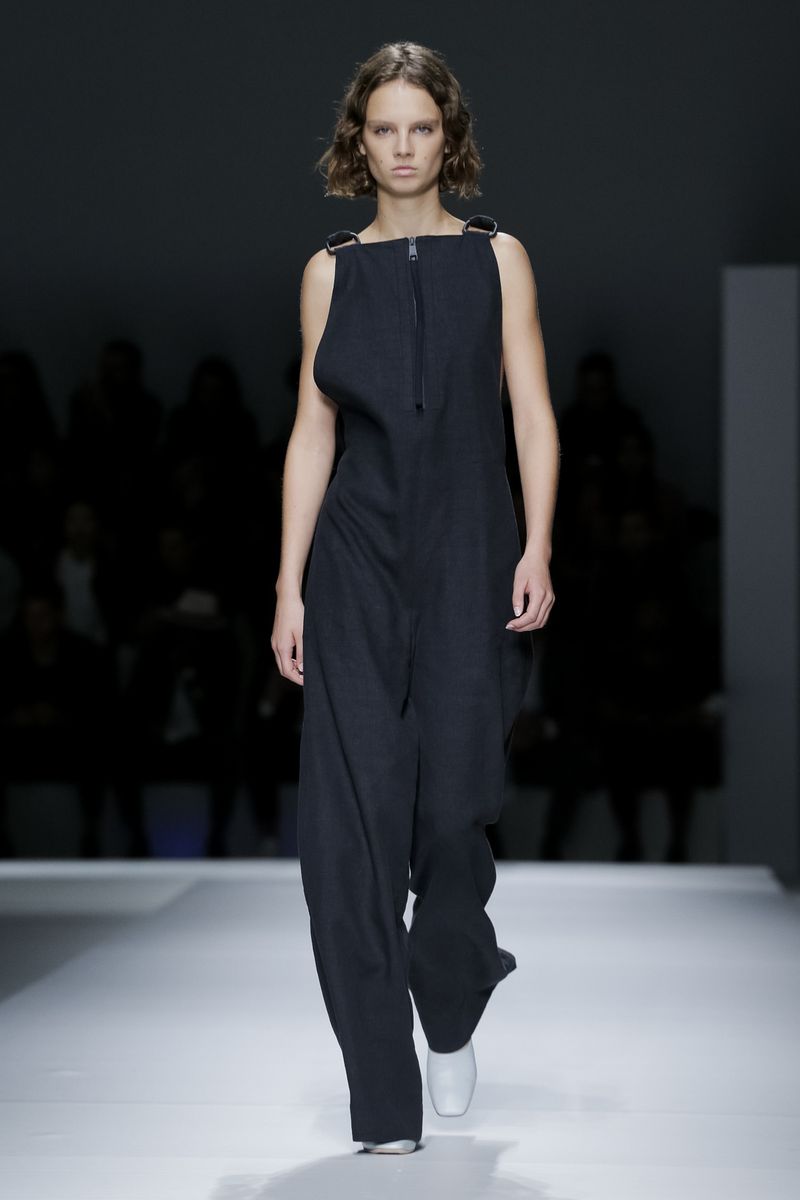 Com ombros de fora e a manga ombro a ombro posicionada bem abaixo do usual, Gabriela Hearst romantizou o macacão. Moderno pelo corte e com mangas bufantes curtas, a estilista garantiu o estilo da peça.