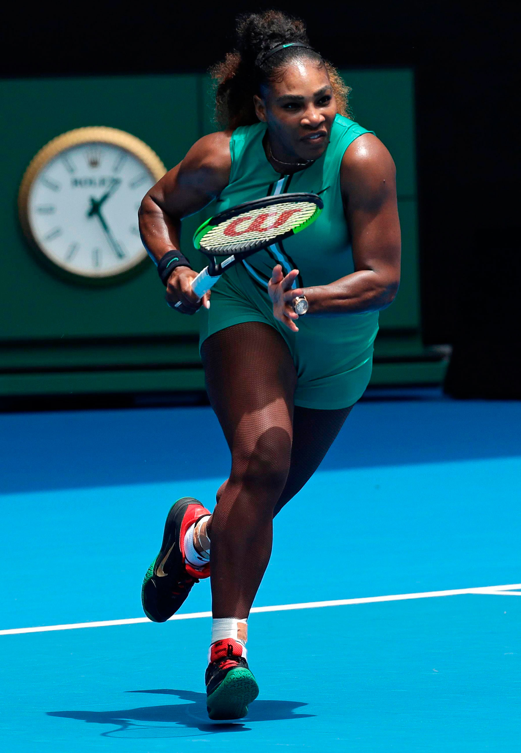 A bordo de um macacão verde curto e bem coladinho ao corpo, ela surpreendeu com uma peça de roupa nunca vista antes nas quadras: uma meia arrastão. O item, que ganhou fama nos anos 1970 como um dos símbolos de moda do movimento punk, caiu feito luva na moda esportiva da tenista.