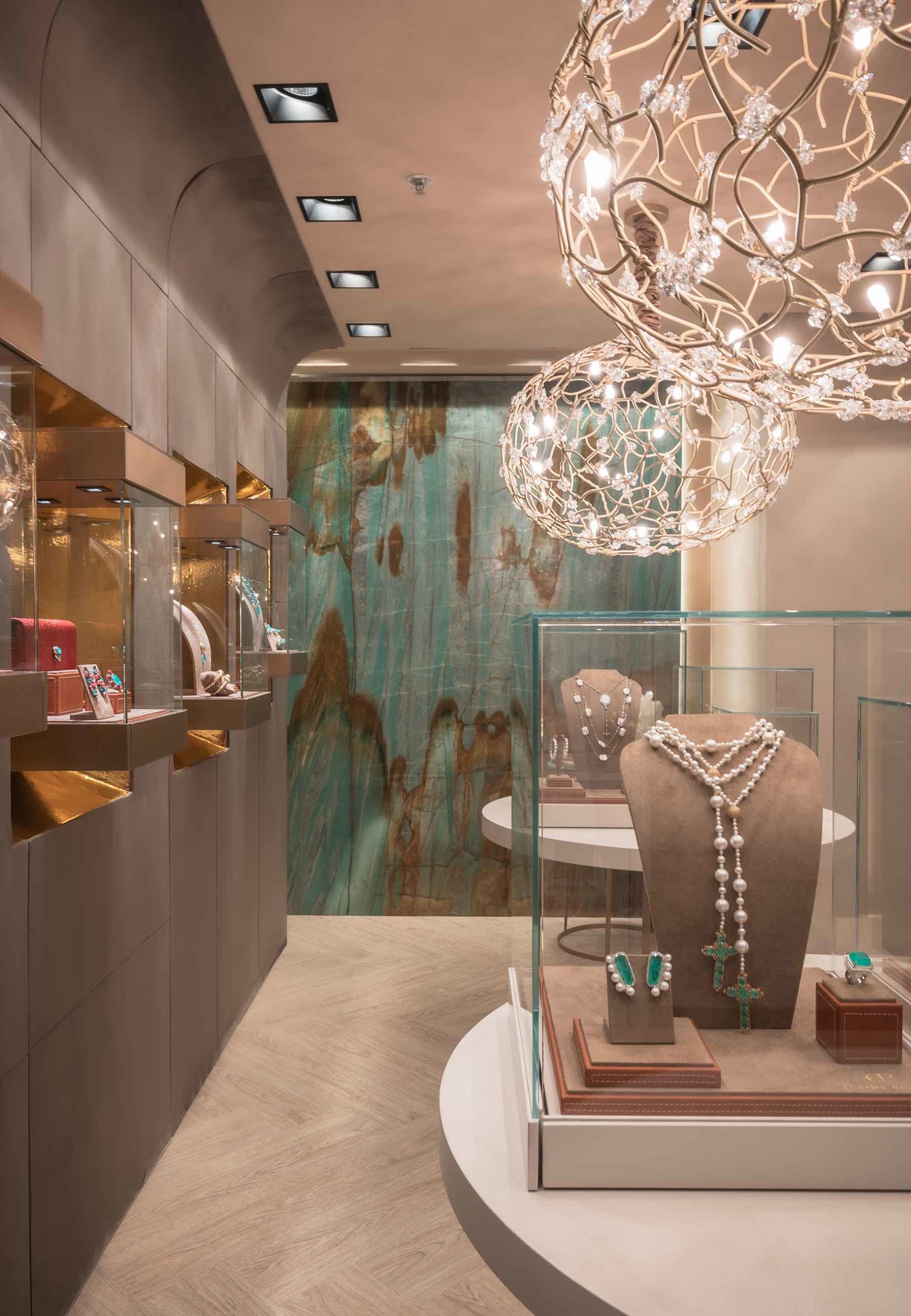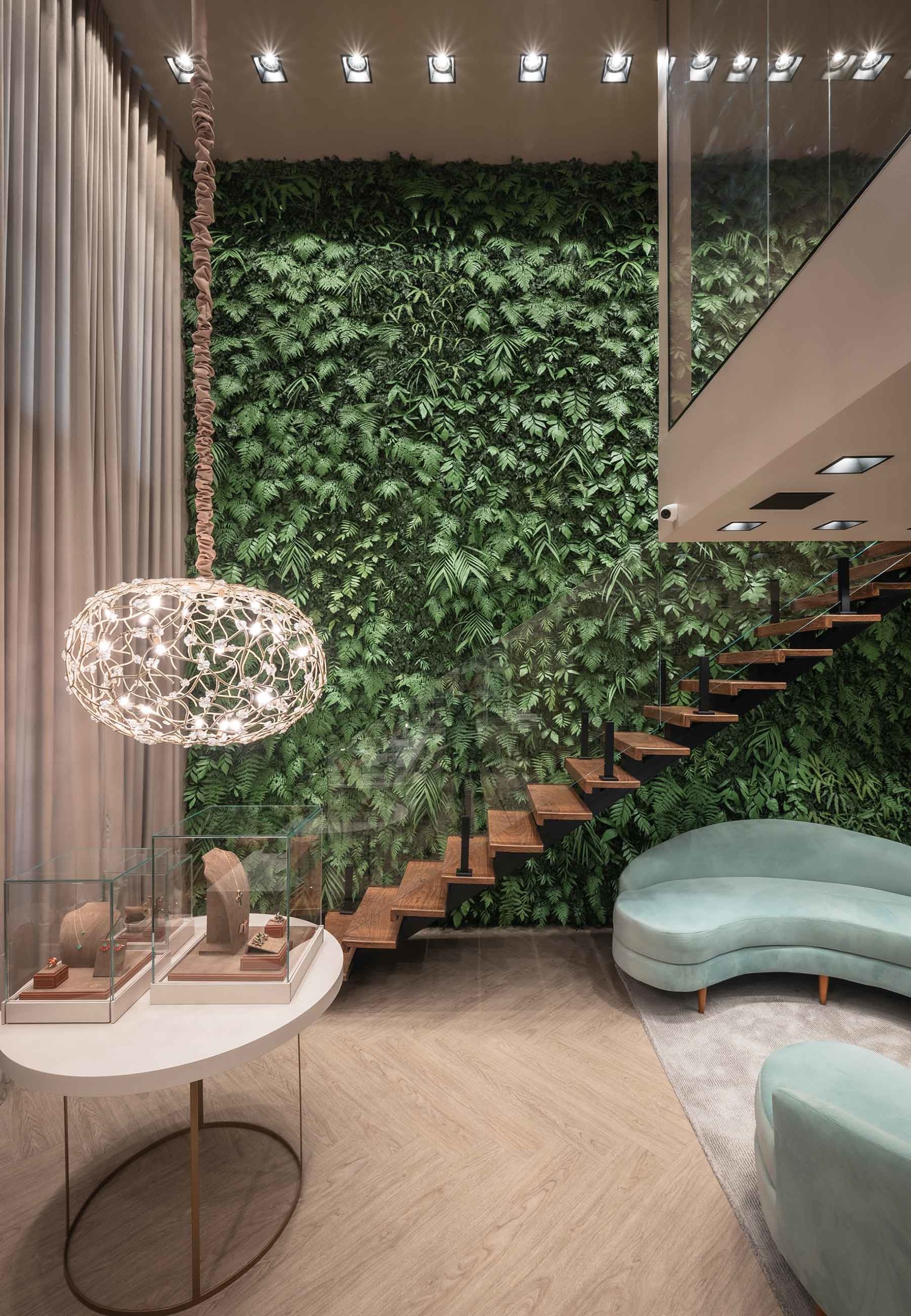 Móveis de design, lounges aconchegantes e ambientes exclusivos para consultoria de estilo fazem da Maison Elaine Palma um templo das joias contemporâneas. Como em uma ‘timeline’, os visitantes podem conferir a história das peças icônicas criadas pela designer: peças em turmalina fusion pontificam ao lado de seus famosos brincos em forma de orquídea e de perfumeiros, além de peças em galuchat e lacquer francês e italiano.