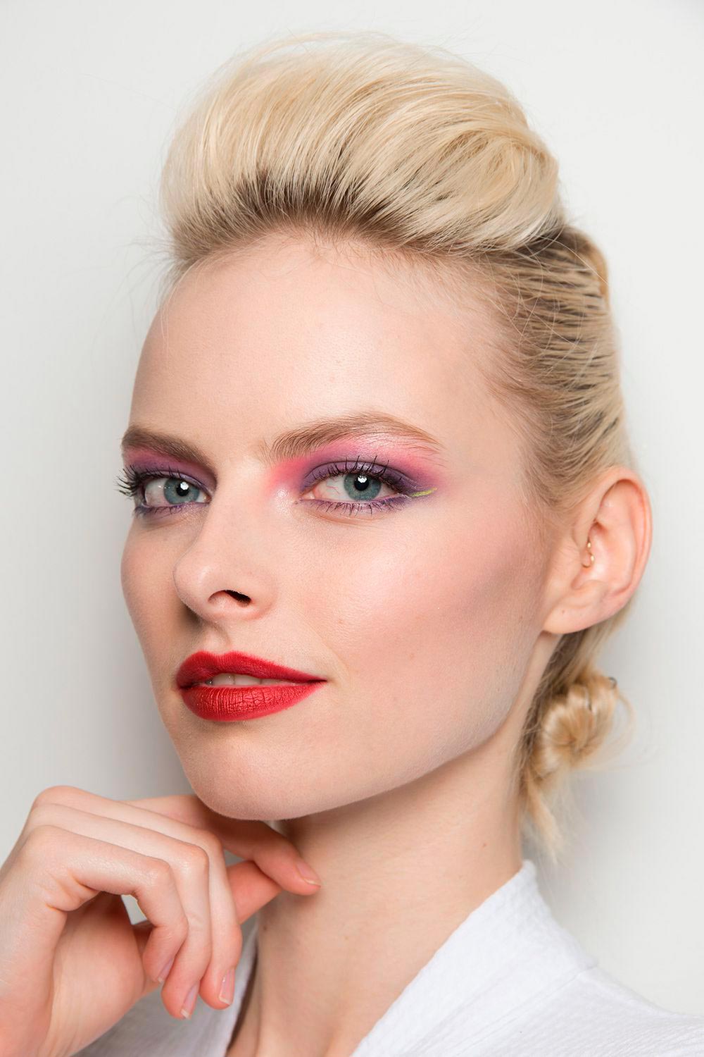 A Ralph & Russo fez um mix inusitado em dois tons: roxo (na pálpebra móvel) e rosa (rente à sobrancelha. O roxo também colore a linha inferior dos cílios. Sugestões de makes: