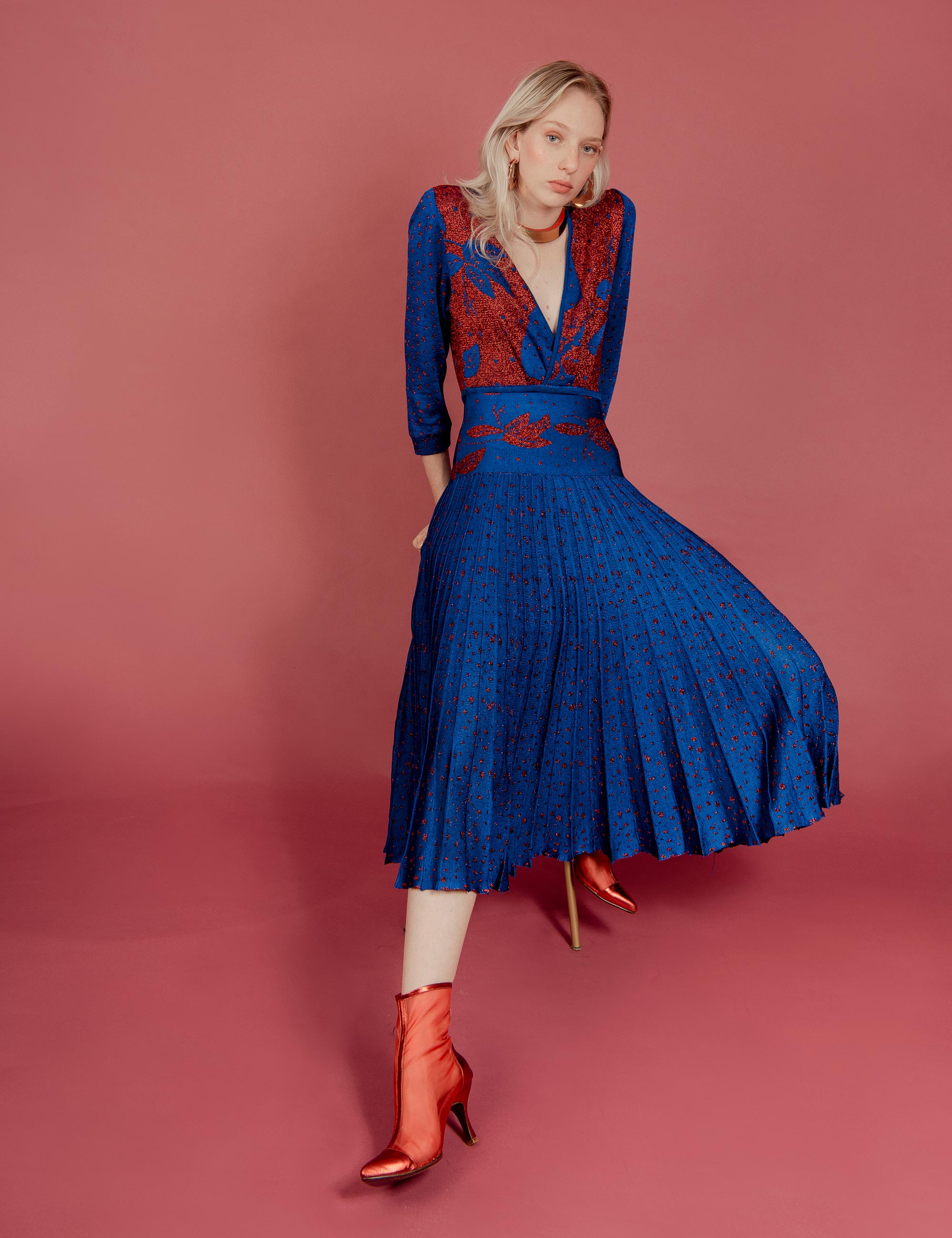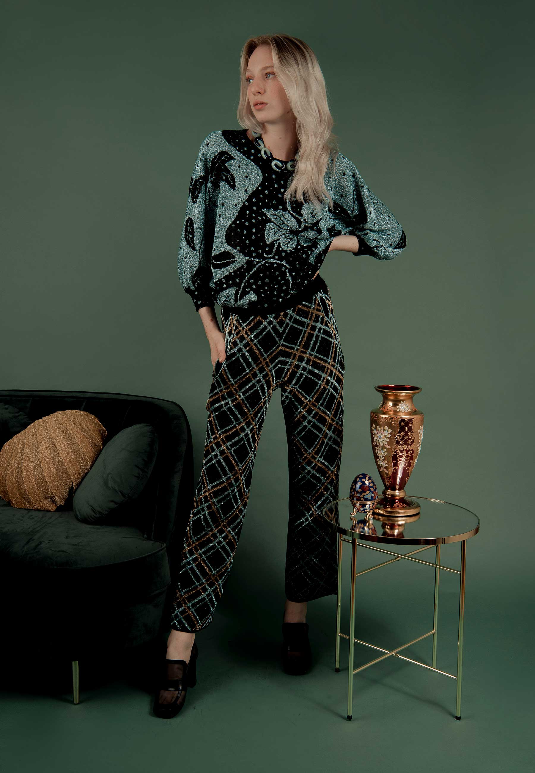 A tela proposta por Manolita conversa com o tricô característico de GIG, assim como o detalhe metalizado nos sapatos com o lurex nas roupas.