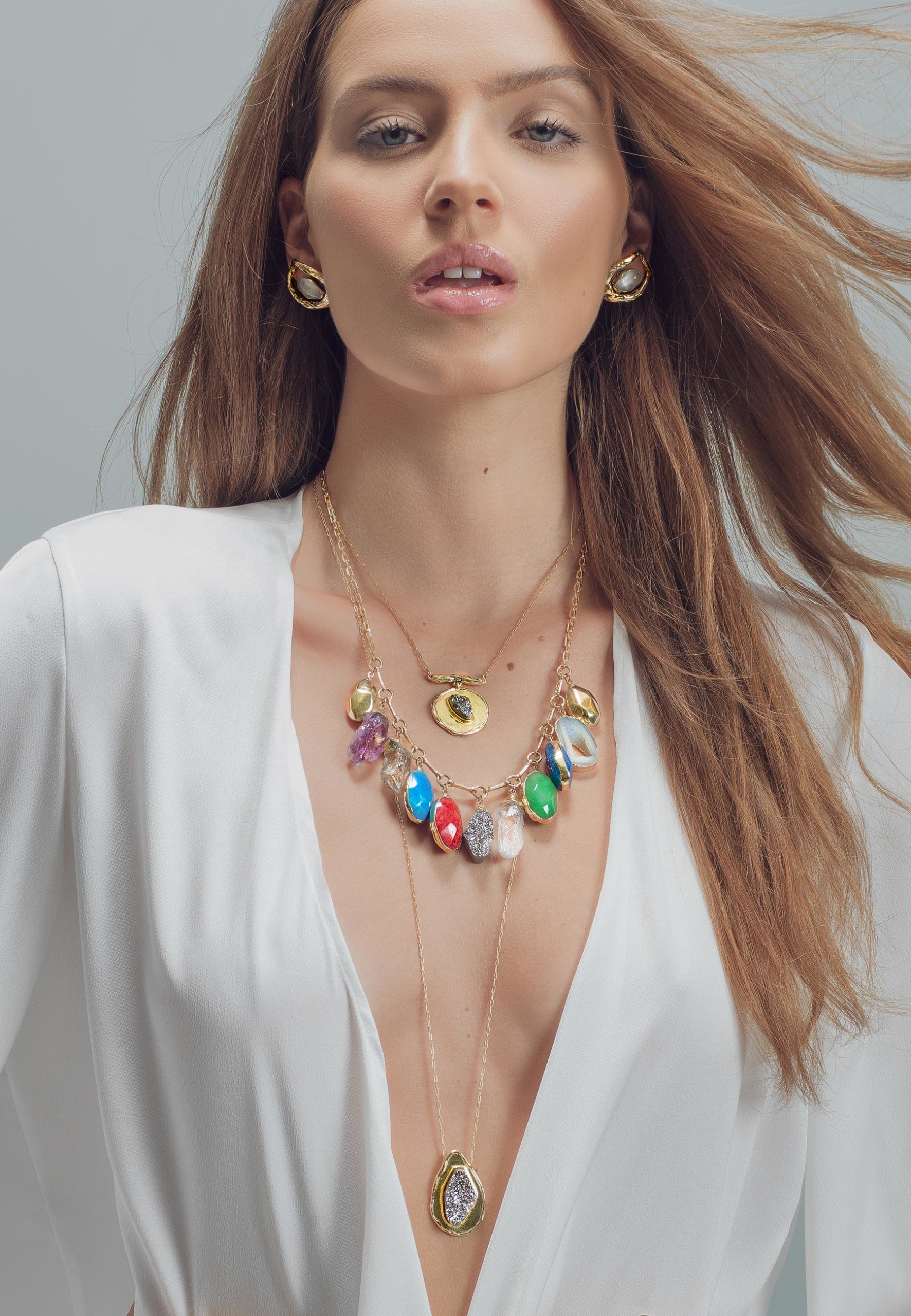 Maria Dolores também aposta no electroplating, técnica que permite que o metal tenha aderência a beleza natural das bordas das pedras. Já nas lojas e no e-commerce da label!