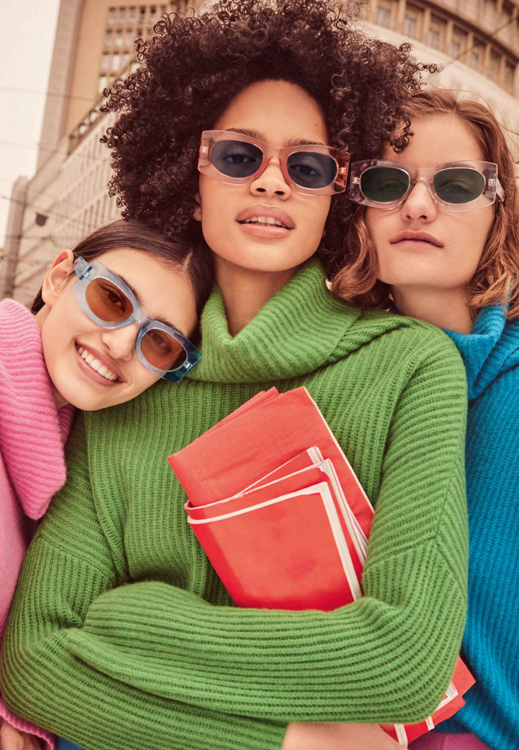 De formato futurista, o modelo de máscara, um dos clássicos da Max&Co., ganha formato fino e quadrado, com perfis espessos e arredondados nas hastes – uma silhueta ousada e sedutora. Na mesma linha, os óculos de armação transparente e colorida conferem brilho e personalidade.