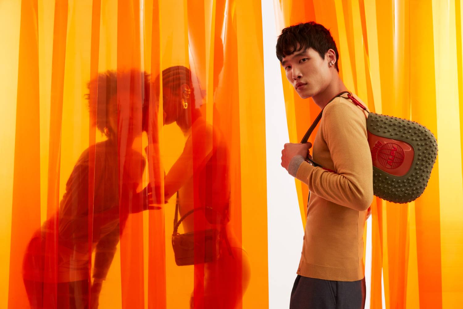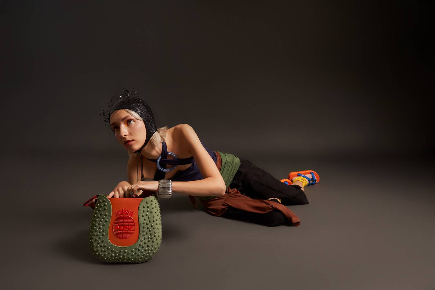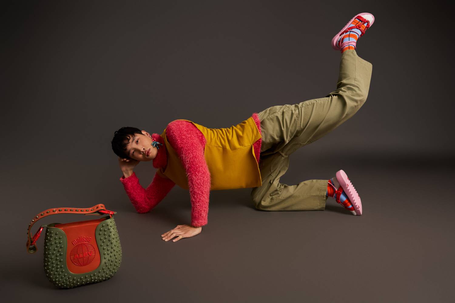 “A bolsa Nina talvez seja o melhor exemplo desse encontro: ela mistura a estrutura da Moon Bag da Melissa com a tampa orgânica e marcante da minha Messenger. E aí entram as texturas de solados clássicos de calçados que muitas vezes estiveram presentes em produtos Melissa, que funcionam como uma camada de código, quem conhece, reconhece. É quase uma escultura que conversa com o passado das duas marcas.”