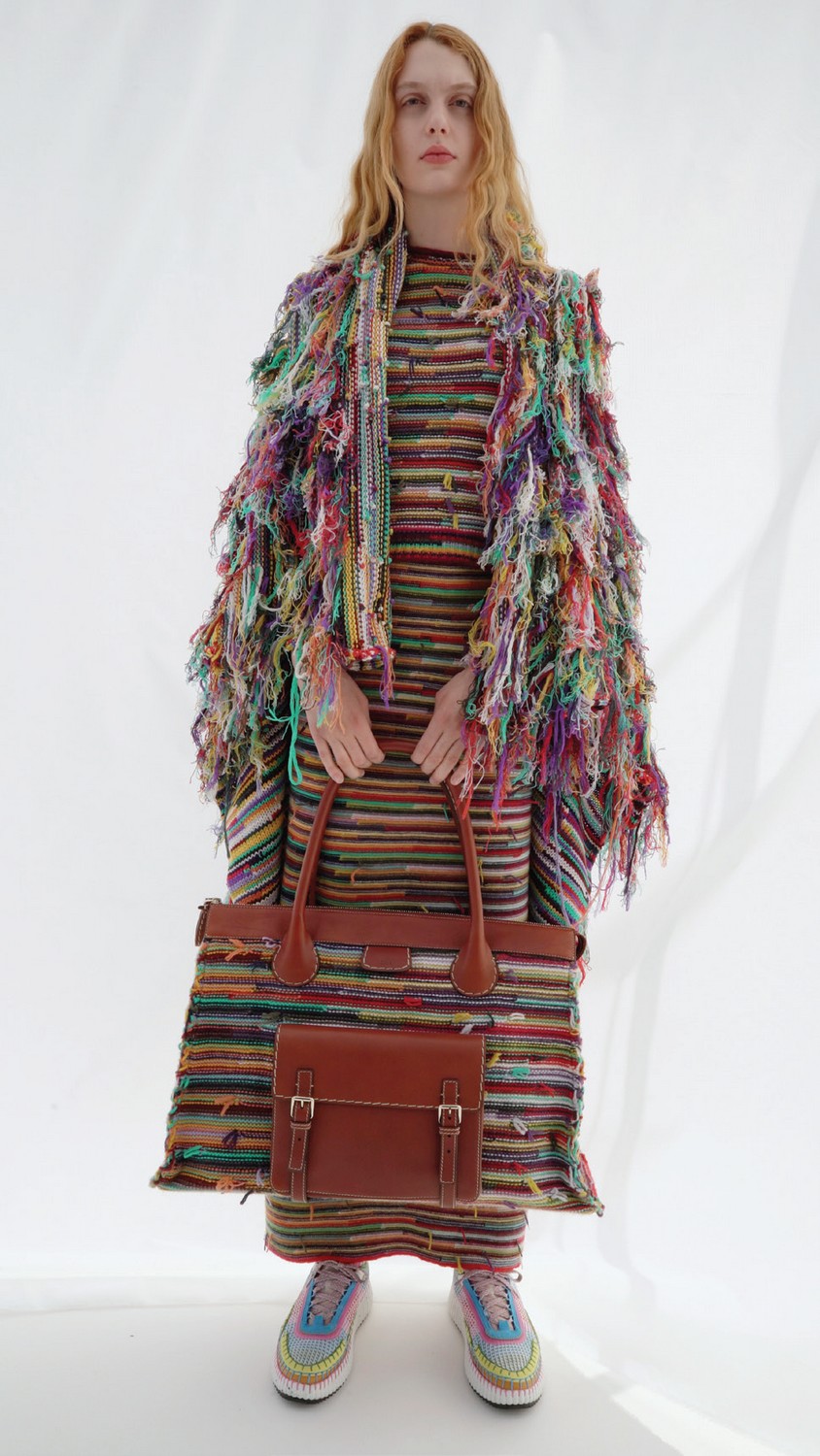 O tricô vem, por exemplo, em listras coloridonas terminando em franja no resort 2022 da Chloé de Gabriela Hearst – a diretora criativa já revelou que se atrai por essa pegada handmade. O vestido tubo chega com aquela linha de emenda que sobra no meio do tricô, geralmente escondida por dentro dos outros pontos, agora bem exibida. Por cima, um mantocasaco felpudão traz ainda mais textura.