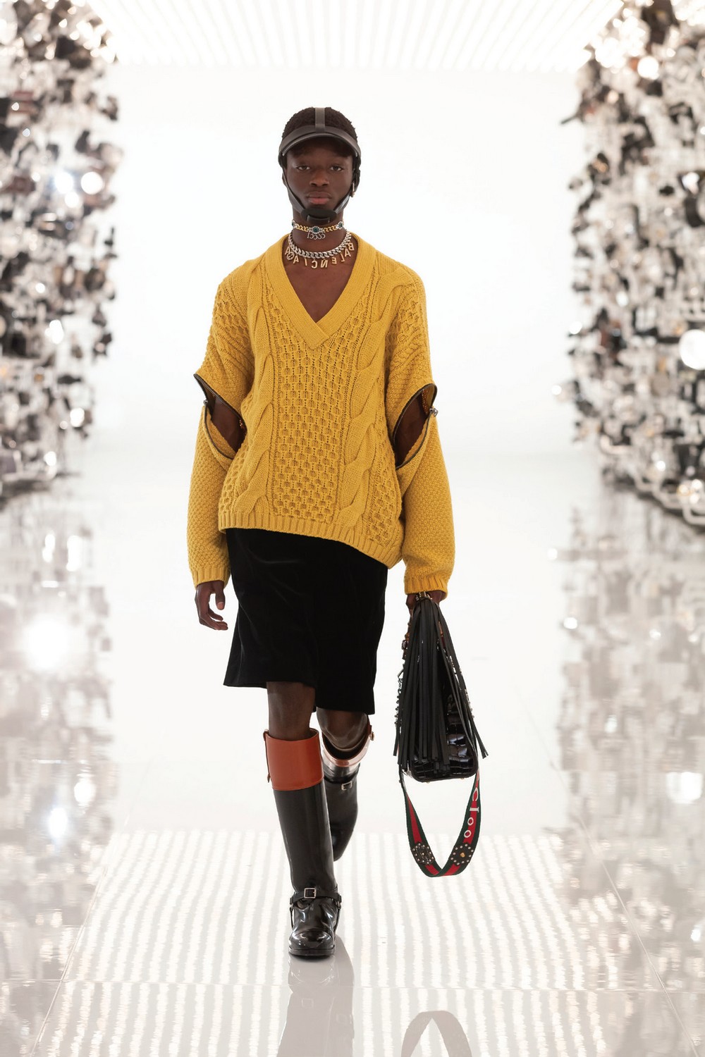 Vimos quase o mesmo efeito grunge no inverno 2021 da MM6 Maison Margiela. Aliás, uma das grandes referências fashion desse tricô do momento é o grunge, com sua cara de segunda mão. Vale brechó ou roubar aquele que a avó (olha ela aí de novo!) não usa mais.