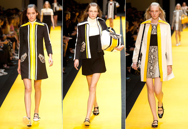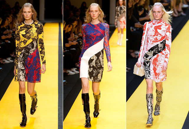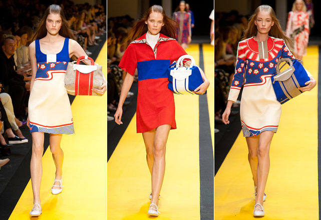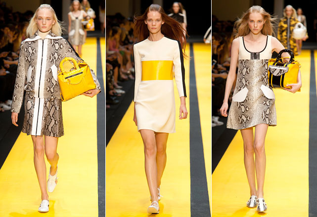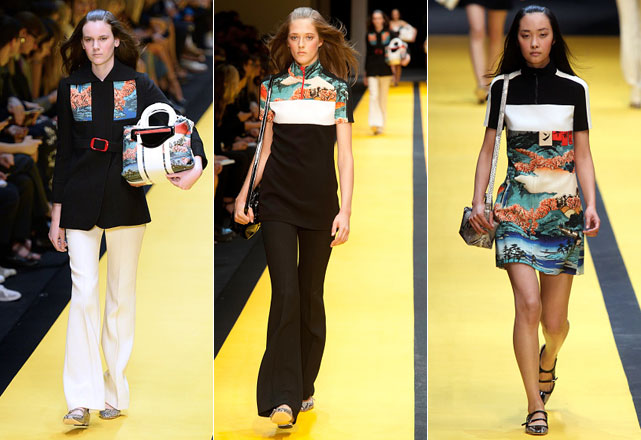 Aos poucos, Guillaume vai inserindo píton e estampas de ilustrações características da cultura japonesa. Flores de cerejeira e o monte Fuji, são alguns dos motivos dos prints que ajudam a suavizar a silhueta característico do movimento MOD. Destaque para as bolsas, a marca investiu pesado em dois modelos específicos e foram raras as entradas em que as modelos não seguravam um de seus lançamentos nas mãos, ou à tiracolo!