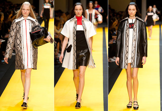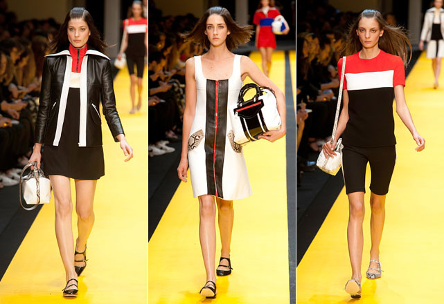 Mini e em linha A, é assim a silhueta do verão da Carven. Guillaume Henry, francês responsável pelo revival da Maison, vai na contra-mão dessa estação, insistindo nos anos 60 bem como foi resgatado no inverno passado e desconsidera a onda 70´s que tomou conta dessa estação. O couro é o principal material da coleção, faixas cortadas à laser amarram os casacos, minissaias e vestidinhos estruturados que pontuam a apresentação.