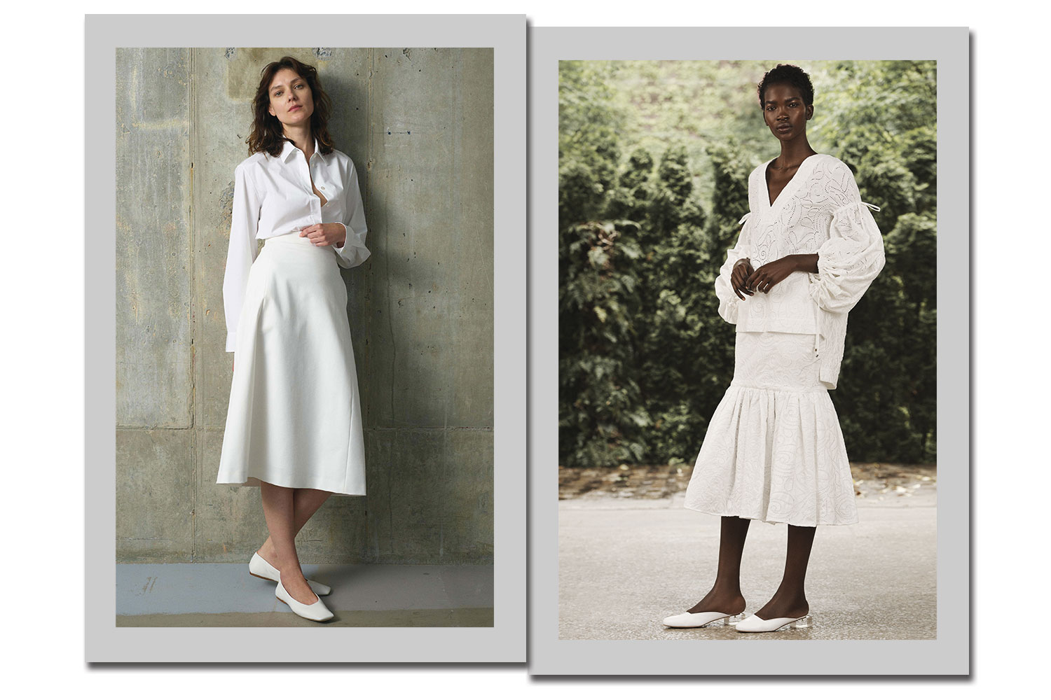 Ele nunca pode faltar na mala do verão! Tem look com calça e casaco da Max Mara (à esquerda) e o combo do vestido com saia e sapato – tudo branco – de Gabriela Hearst (à direita).