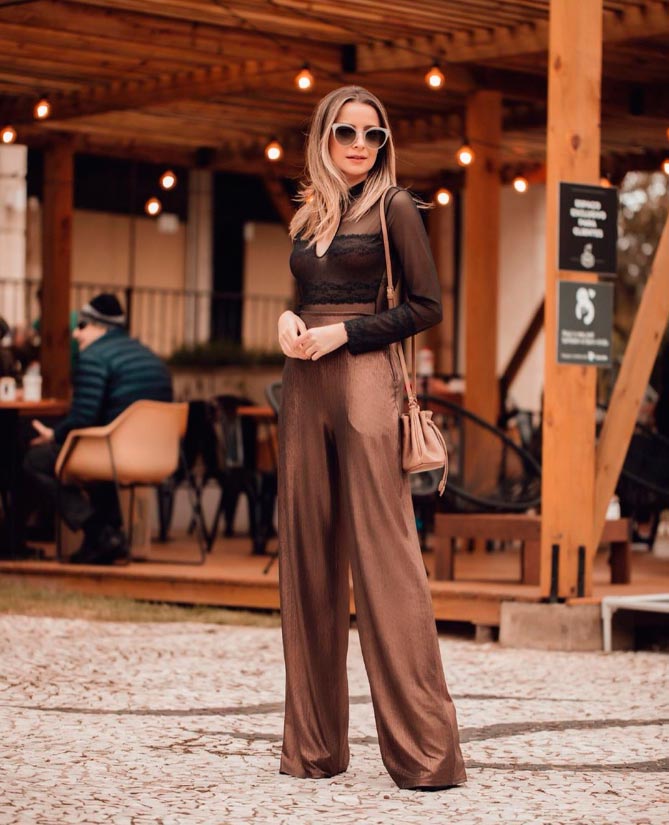 “Para desconstruir a ideia de que lingerie aparente é vulgar, aposte em peças de alfaiataria, que são sempre ótimas opções ao montar o look”, orienta. “Você também pode dar preferência a uma pantalona metalizada, que está em alta”, acrescenta.