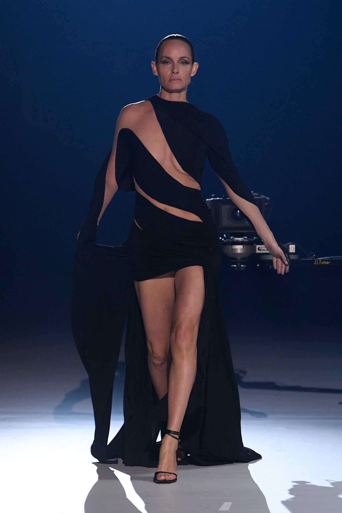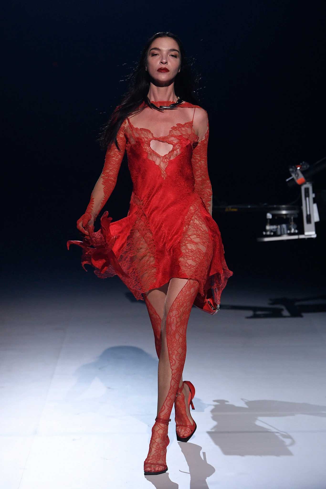 O que seguiu foi uma experiência voyeurista. O espetáculo foi eletrizante e erótico, com visuais desfilados em alta-velocidade e com uma trilha sonora de ritmos eletrônicos, étnicos e pop. Amber Valetta, Eva Herzigova, Irina Shayk, Shalom Harlow, Adut Akech e Arca fizeram parte do elenco poderoso que desfilou enquanto uma enorme tela reproduzia os melhores closes da passarela.