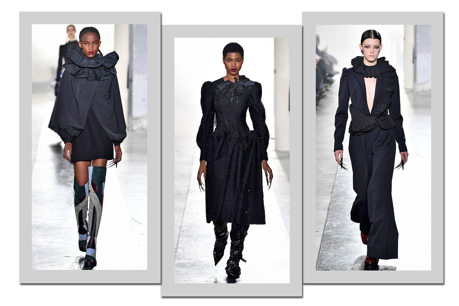 O inverno 2022 da Rochas brinca com os volumes. Por vezes, eles aparecem delicados, em mangas bufantes que se ampliam e ajustam ao longo do braço. Mas quando o assunto são as golas, elas ganham mais dramaticidade, como os babados do modelo que remete à era vitoriana. A escolha da amplidão depende muito do gosto e do estilo de cada pessoa, mas um ombro mais estruturado, uma gola com mais camadas ou um vestido que abre ao longo do seu comprimento podem ser opções para acrescentar volume ao all black.