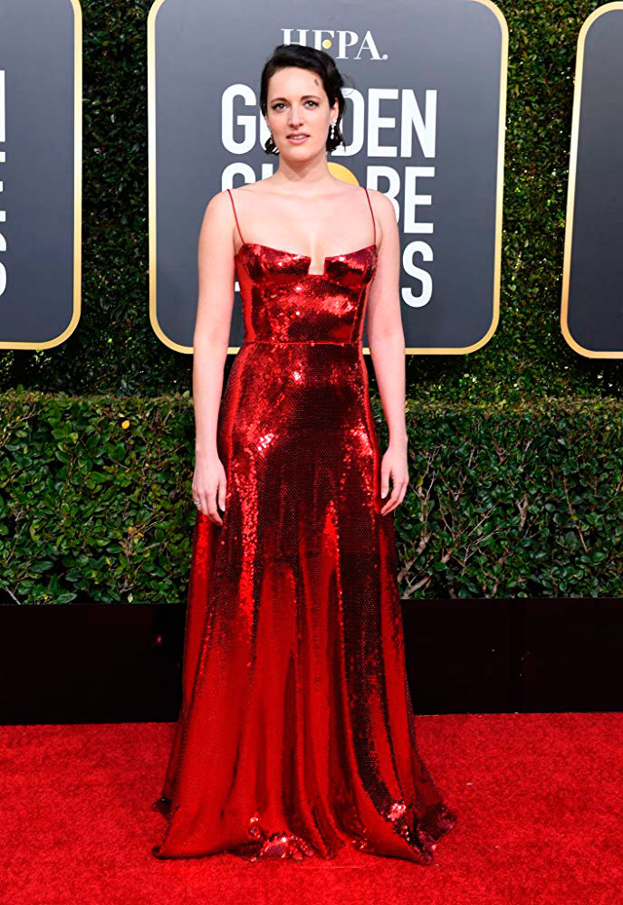 Outra atriz que apostou em um modelo com material metálico foi Phoebe Waller-Bridge, que pousou para fotos no tapete vermelho do Golden Globes com o modelo da Galvan. Outro detalhe interessante do vestido é o decote com finas alças.