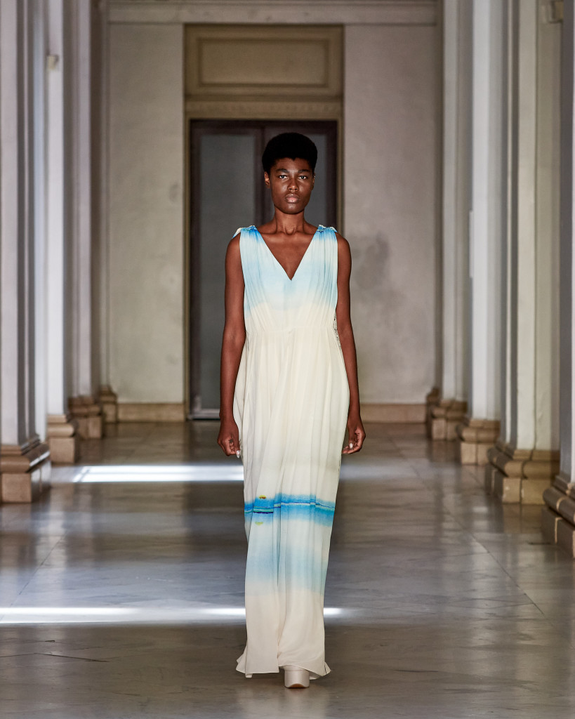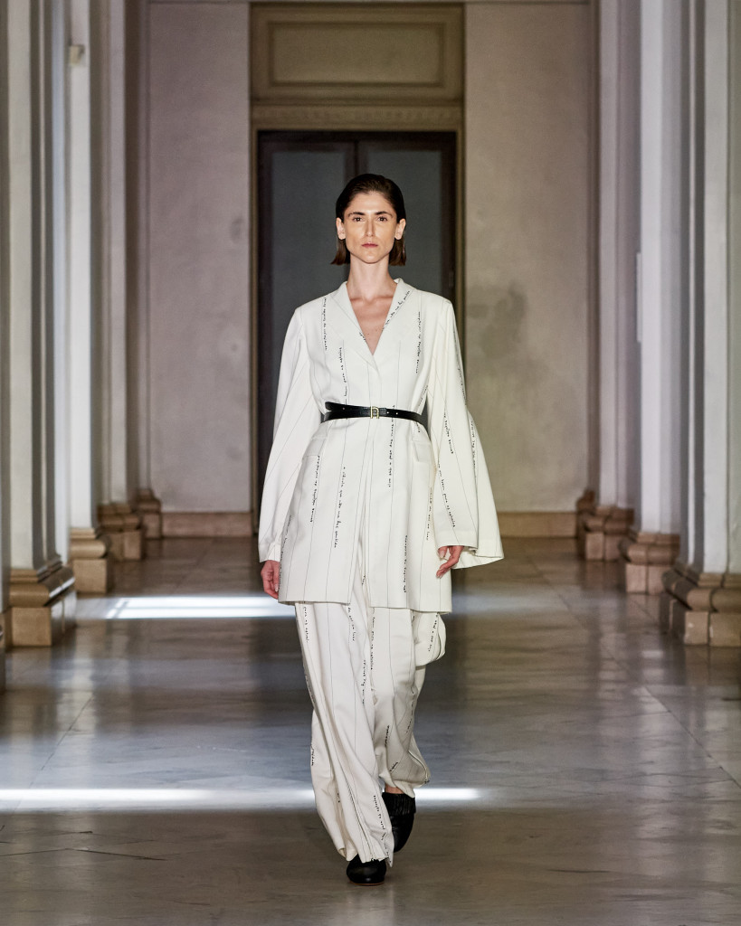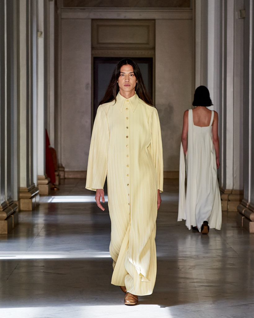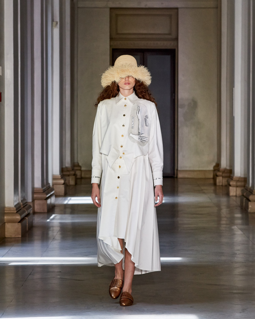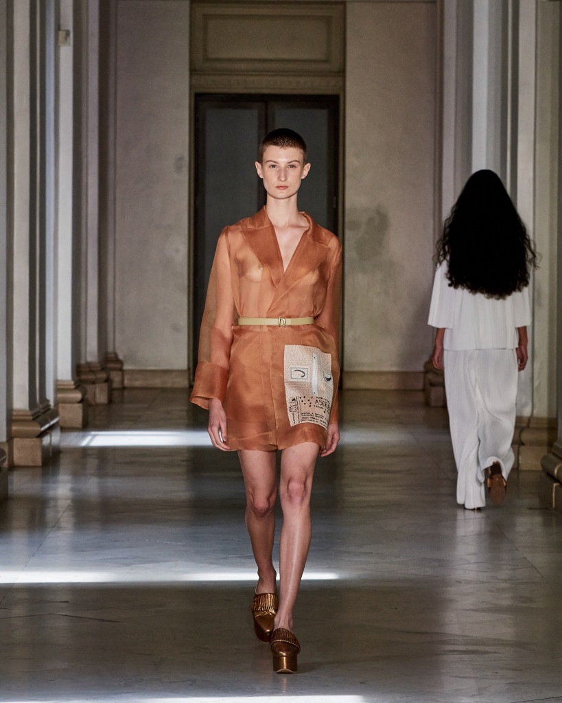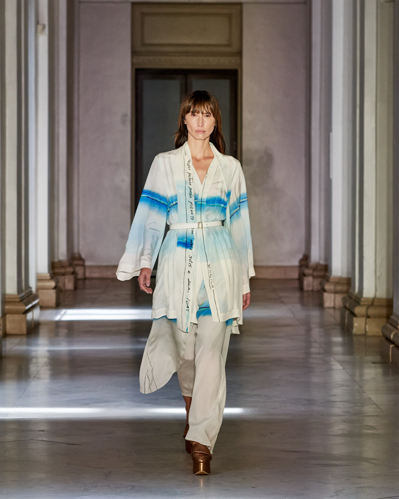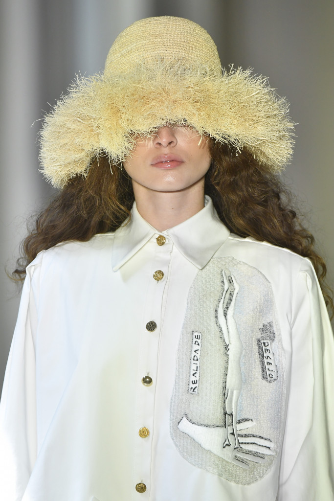 A narrativa era organizada e se dividiu em três momentos, descritos como “pérolas, andarilhos e âncoras”. No primeiro, a fluidez protagonizou ao lado de bordados com frases de autores diversos, como em um diário ambulante, enquanto, na segunda, a alfaiataria e as transparências tomaram a passarela. Tudo era artsy, sim, mas com a leveza que curou a “pretensão” discutida por Rafaella. O terceiro bloco, um pouco mais filosófico, materializou o “retorno às origens” em tons terrosos – mais uma ode ao poema de Kafávis sobre a viagem odisseica de Ulisses para sua casa em Ítaca.