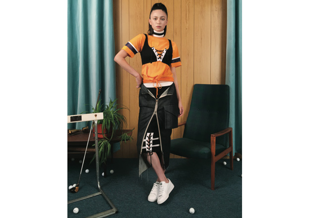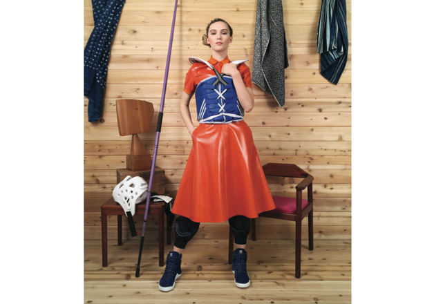 DINAMARCA Jessica Smith (Option Model) veste camisa polo e saia de jérsei revestida de borracha Lacoste; calça de cetim de seda Giorgio Armani; e tênis Adidas – Foto: Chris Hornbebker