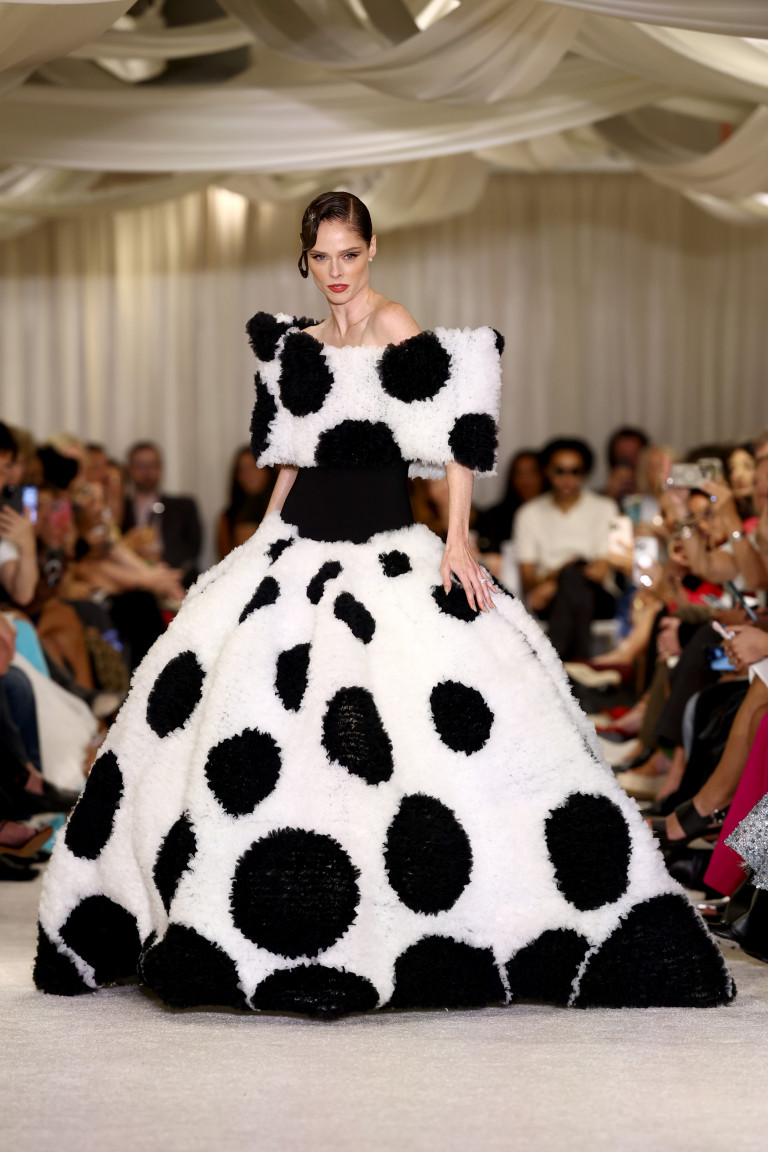 A vibe preto e branco dominou a passarela até que a cor explodiu nos vestidos de festa como o azul Tiffany e o metálico brilhante. Saias balão, ombros oversized e barras arredondadas deram leveza e um pouco de drama aos looks. Os chapéus – um tanto quanto excêntricos – deram o toque final de glamour clássico de Hollywood.