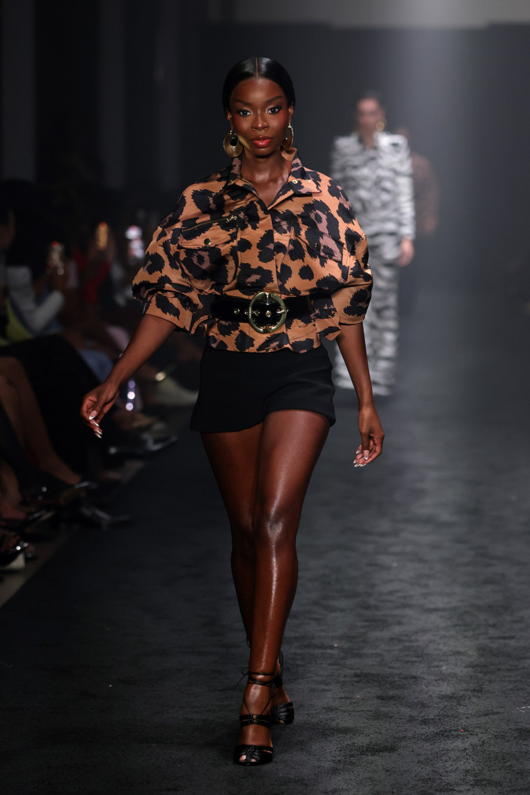 Fazendo sua estreia na passarela: ninguém menos que Olandria Carthen, a estrela do reality Love Island USA, usando uma jaqueta em animal print, combinada com mini shorts, cinto preto e dourado, e saltos, completado por coque baixo e unhas em francesinha.
