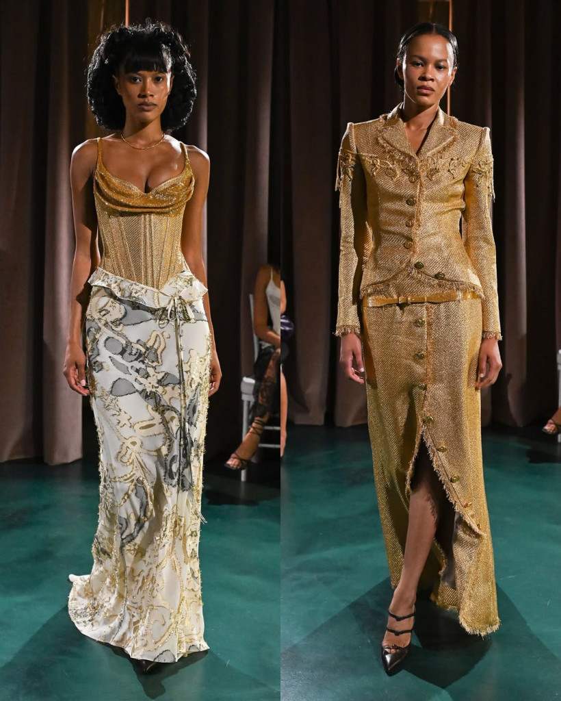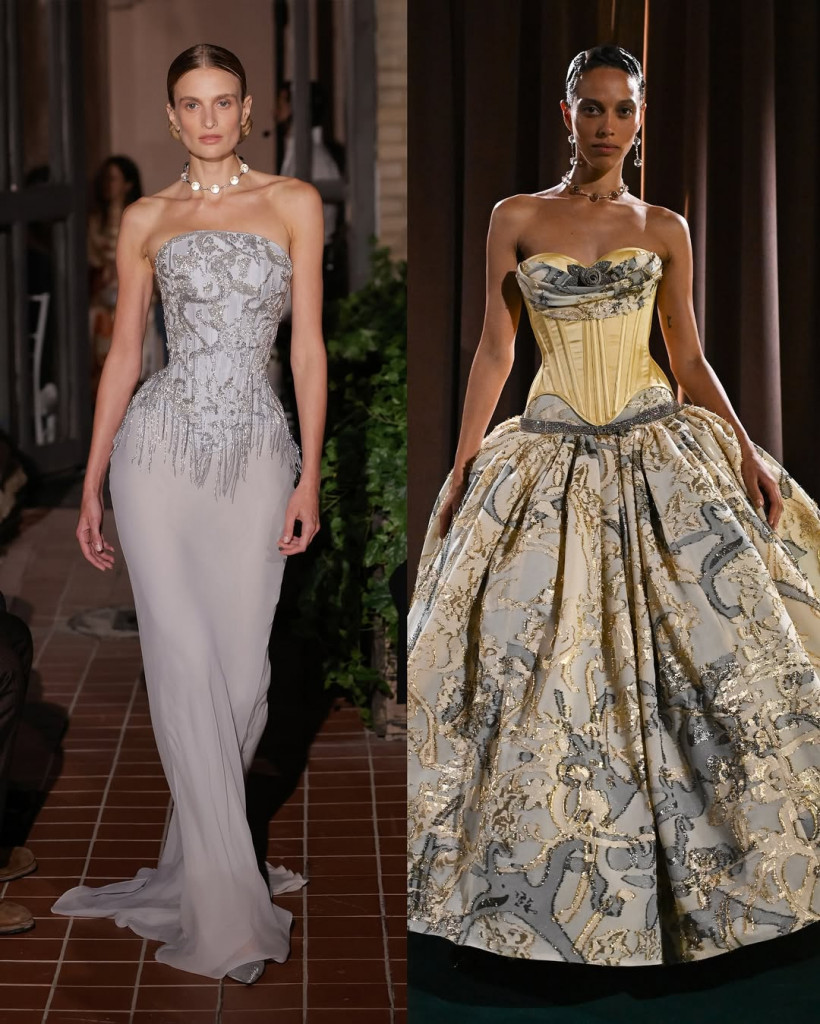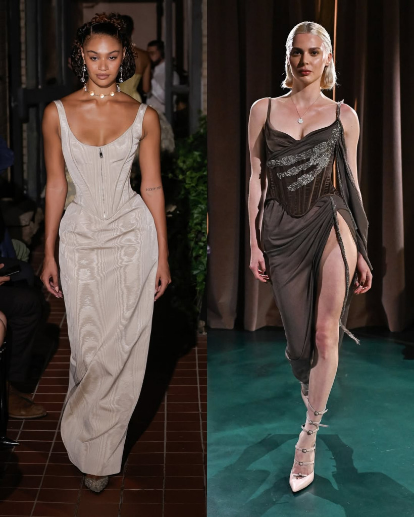 O desfile de Primavera/Verão 2026 da Wiederhoeft, batizado de “Lost Works”, foi uma experiência quase cinematográfica. Apresentado no salão da marca em Nova York, o show parecia uma viagem por memórias esquecidas, com peças que combinaram estrutura, fluidez e bordados minuciosos. Corsets elaborados em seda, lamê e veludo ganharam vida com cristais, contas de vidro e franjas, enquanto saias longas e drapeadas completaram o clima de elegância quase etérea.