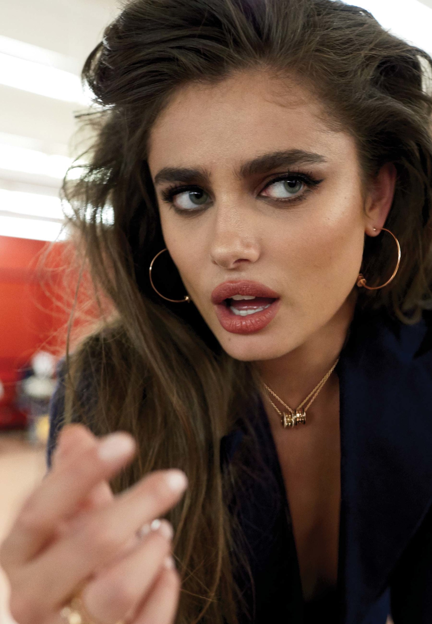 Taylor Hill usa jaqueta da Ralph Laurent. Anéis, pendente e bracelente da Bulgari.