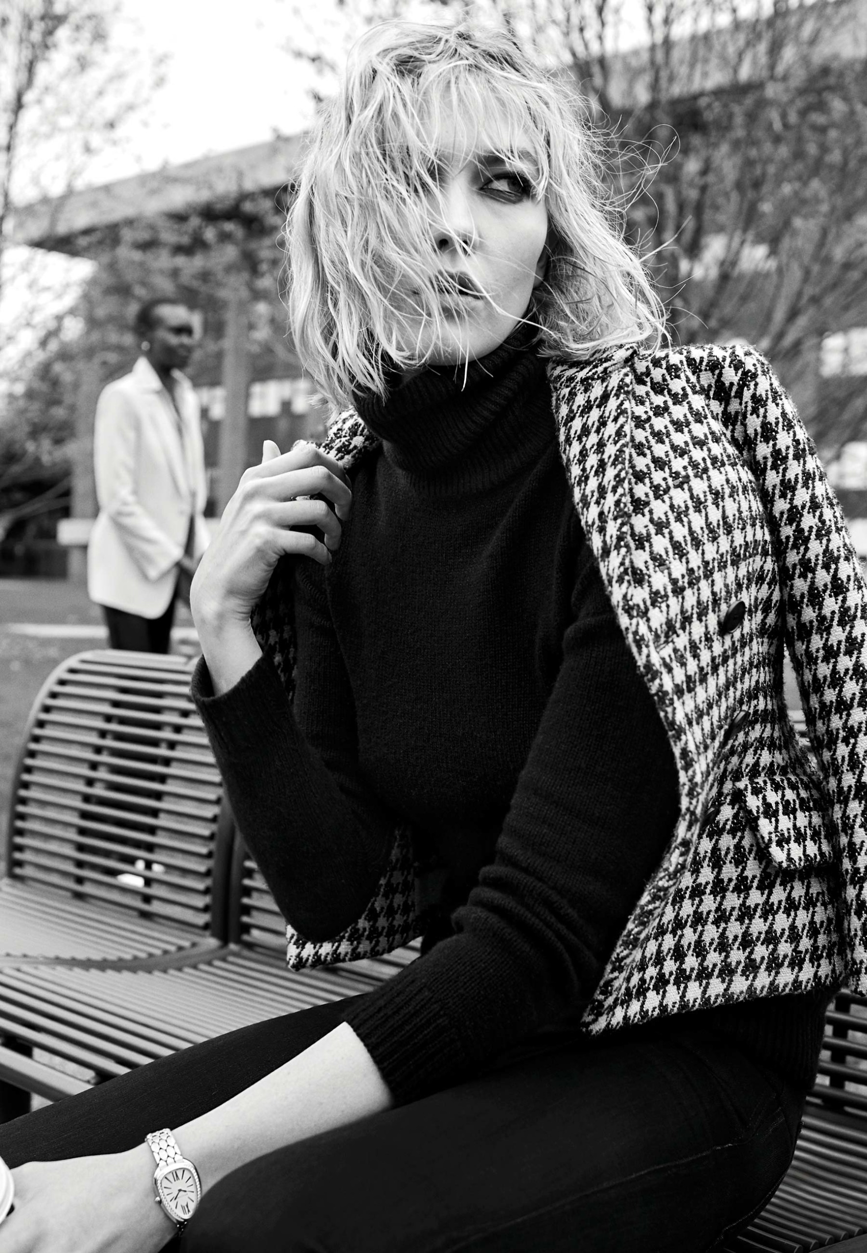 Karlie Kloss usa jaqueta, suéter e calça da Dior. O relógio é da Bulgari.