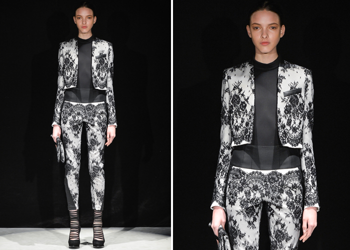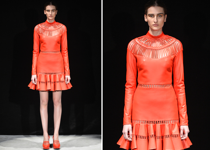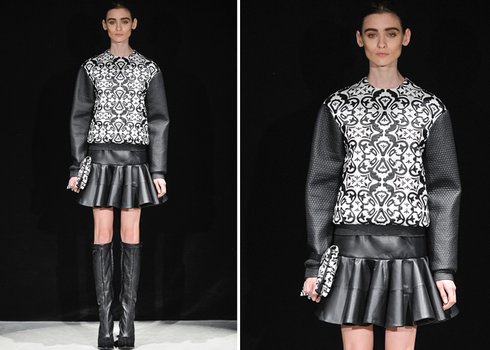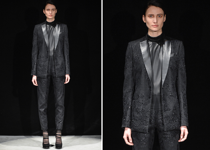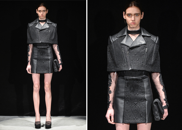 A começar pelos tecidos, trabalhados e manuseados exaustivamente, de maneira extremamente preciosa, para assumir texturas novas e sofisticadas. Tem que ver de perto, pegar na roupa, para ter a melhor percepção. É o caso dos sutis adamascados na gabardine, preto no preto. E do couro, principal matéria da coleção, que, além de seu estado liso, meio rocker, meio fetichista – como nos vestidos curtinhos e de mangas longas, de saiota godê; ou nas lapelas dos casacos; ou ainda nos ombros pontiagudos dos vestidos armadura –, deriva também em micromatelassês, em formato de colmeia; nas tiras esticadas em babados localizados nos ombros; ou nos delicados arabescos recortados a laser e aplicados sobre tecidos lisos. Quando no tule, contam com a força da transparência delicada em tops estruturados ou de shape camiseta. As formas mais casuais, como as dos moletons deluxe do final do desfile, aliviam o peso da decoração e atualizam o universo de referência para a vida real.