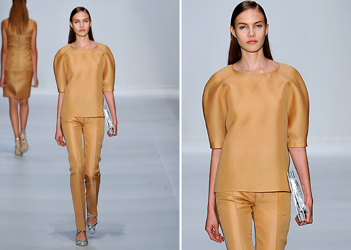 O look: o total nude de mangas volumosas que abre o desfile. Chique demais