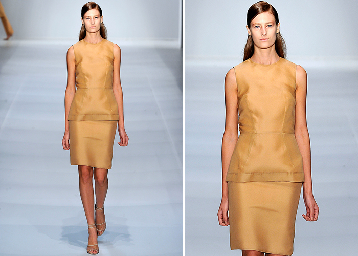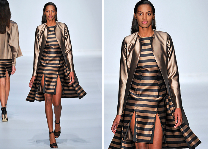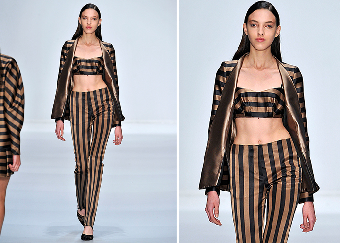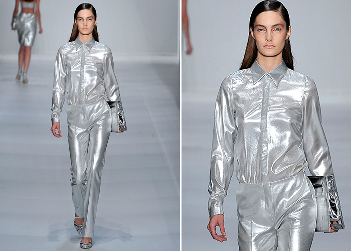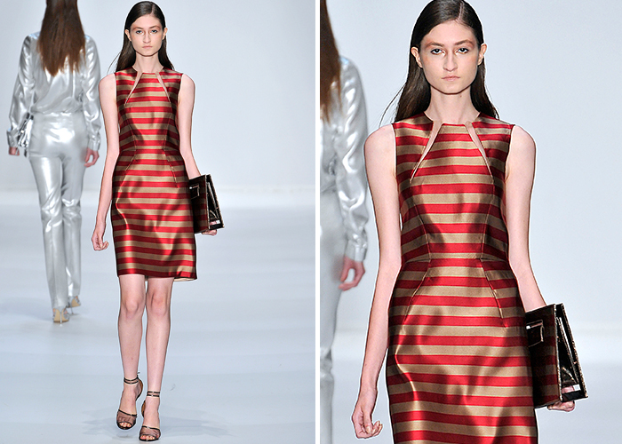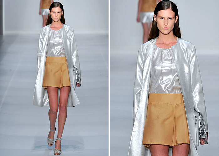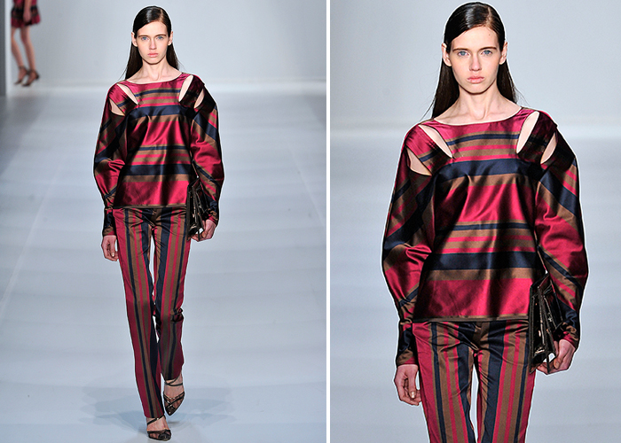 Os elegantes nudes do primeiro bloco abrem alas para um festival gráfico ora em vermelho, marrom e preto, ora em roxo; um sem fim de listras em calças matadoras, vestidos estruturados com recortes estratégicos, tops boxy e casacos sessentinha. Barriga de fora para as mais abusadas, camisas metalizadas, abotoadas até em cima, para as recatadas. Nos pés delicadas sandálias teladas de salto fino.