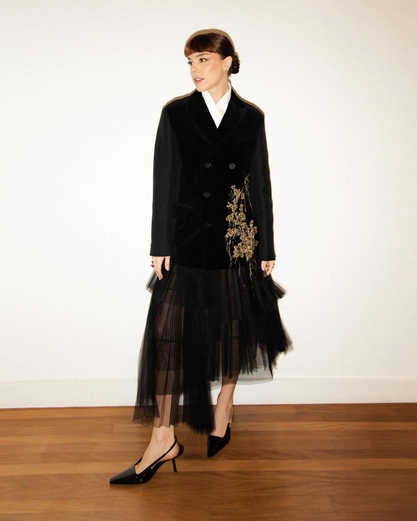 Na vida real, define seu estilo como mais clássico e prático no dia a dia, com espaço para ousadia nos tapetes vermelhos. Tilda Swinton, Cate Blanchett, Natalie Portman, Zendaya, Dua Lipa e Fernanda Torres estão na lista de referências. Nos truques de styling, aposta em peças oversized, lenços no lugar de cinto ou na bolsa, pontos de cor nos pés ou acessórios e o toque final em anéis e brincos. “Não gosto do que me aperta muito. Jeans, camisetas, alfaiataria e tênis estão comigo quase todos os dias”, diz.